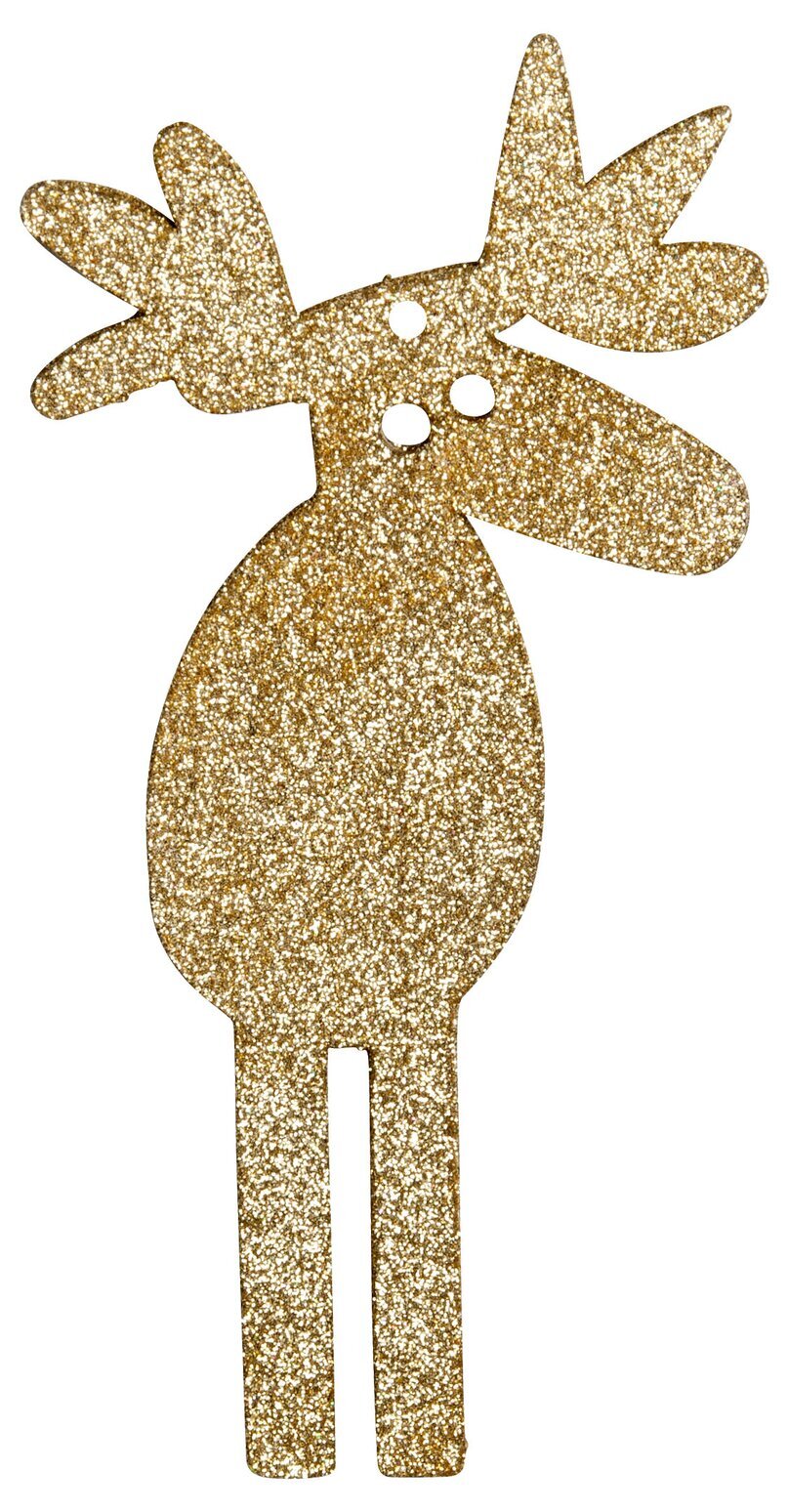 Älgens huvud är rundat och pryds av utstansade ögon, vilket ger en vänlig och lekfull framtoning. Den guldglittriga ytan är tätt täckt med små, glänsande partiklar som reflekterar ljus och skapar en levande glans. Dess slanka konstruktion och glitterdetaljer gör den till ett flexibelt dekorationsföremål för olika typer av miljöer, vare sig det är under jul, fest eller som en året-runt-prydnad.