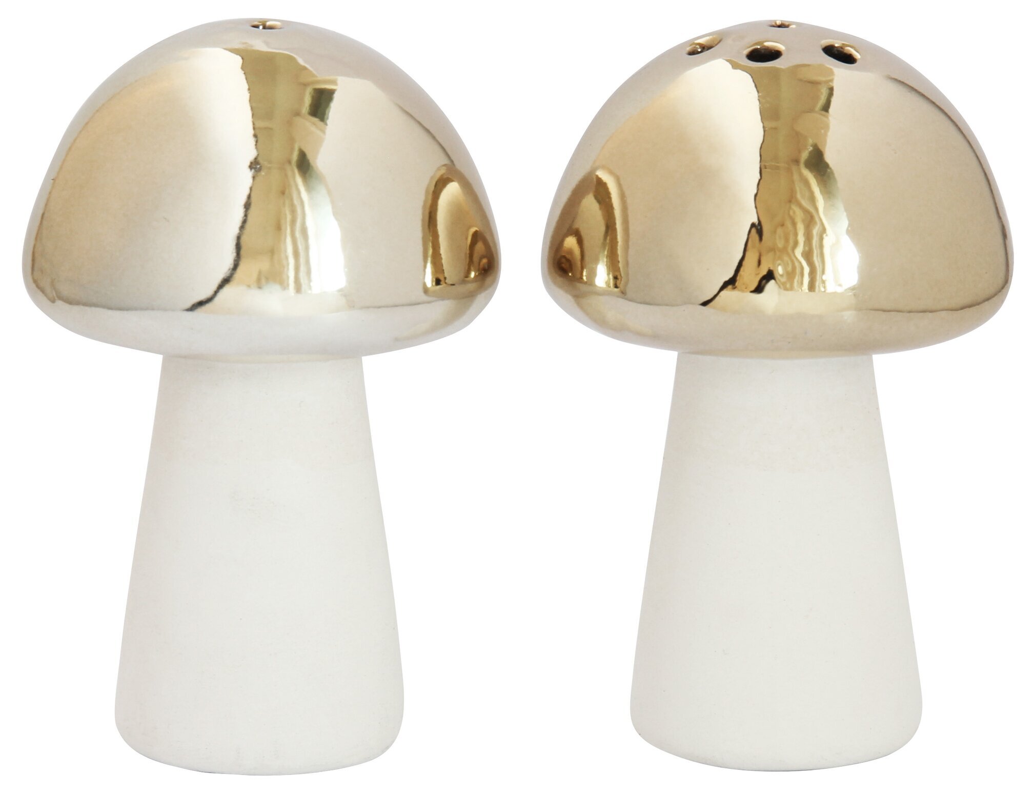 Bilden föreställer ett par salt- och pepparkar formade som svampar, från varumärket Pluto Produkter, tillgängliga hos butiken Köpstaden.se. Dessa små kryddbehållare är designade för att likna svampar, med en bas som smalnar av uppåt och en rundad ovandel.