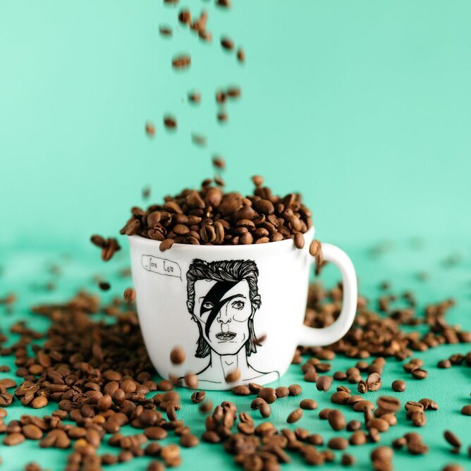 Porslinsmugg med motiv av David Bowie, muggen rymmer ca 350 ml & finns i flera olika utföranden.