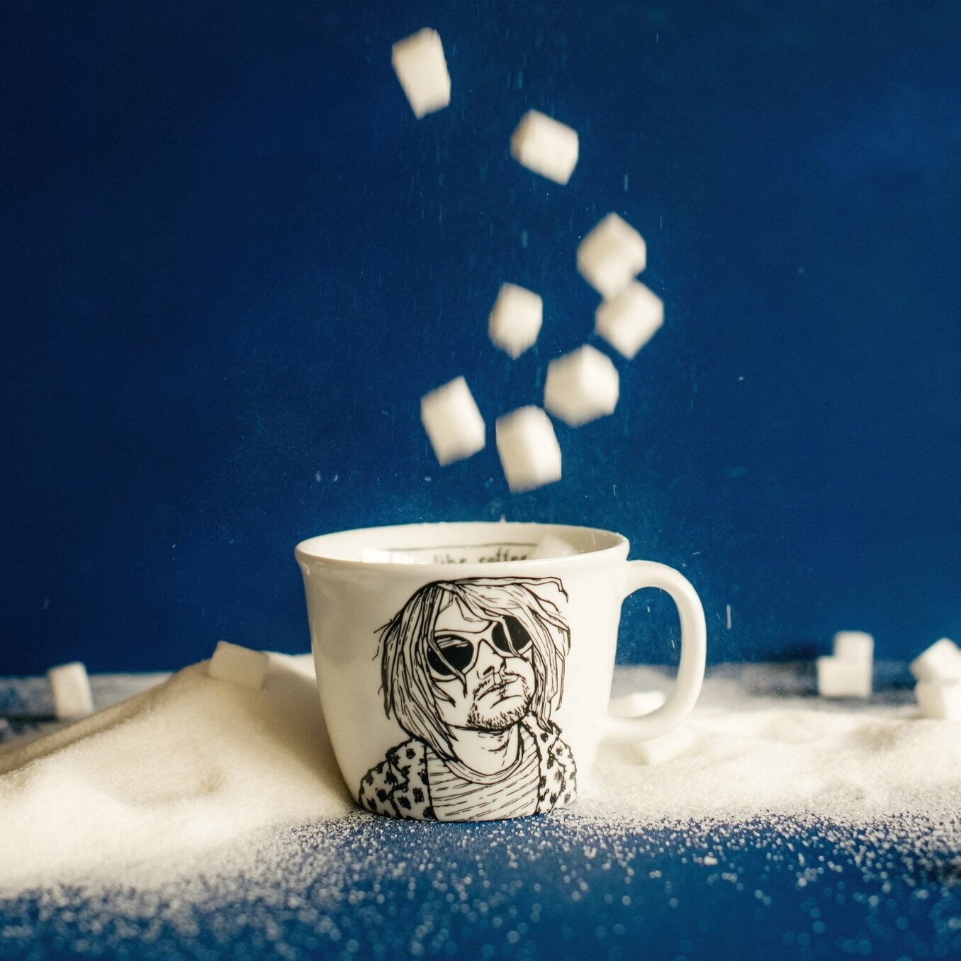 Mot en djupblå bakgrund faller sockerbitar i en kaskad, vilket ger en känsla av rörelse och dynamik i bilden. Dessa kubformade bitar bildar ett oregelbundet mönster medan de svävar ner mot bordet, där de landar på vad som ser ut som ett lager av strösocker. Den vita färgen på sockret skapar en kontrast mot den blå bakgrunden, vilket ger ett visuellt tilltalande intryck och belyser muggen i mitten.