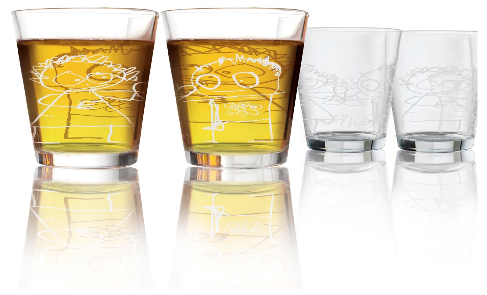 Två av glasen är fyllda med en gulbrun vätska som antyder en lockande dryck. De andra två glasen är tomma och står prydligt i bakgrunden. Det som fångar ögat mest är de unika illustrationerna på glasens yta. Dessa motiv har en barnliknande stil med figurer ritade i vitt, vilket ger en känsla av lekfullhet och kreativitet. Varje glas är prytt med sina egna distinkta teckningar, vilket gör setet både varierat och sammanhängande.