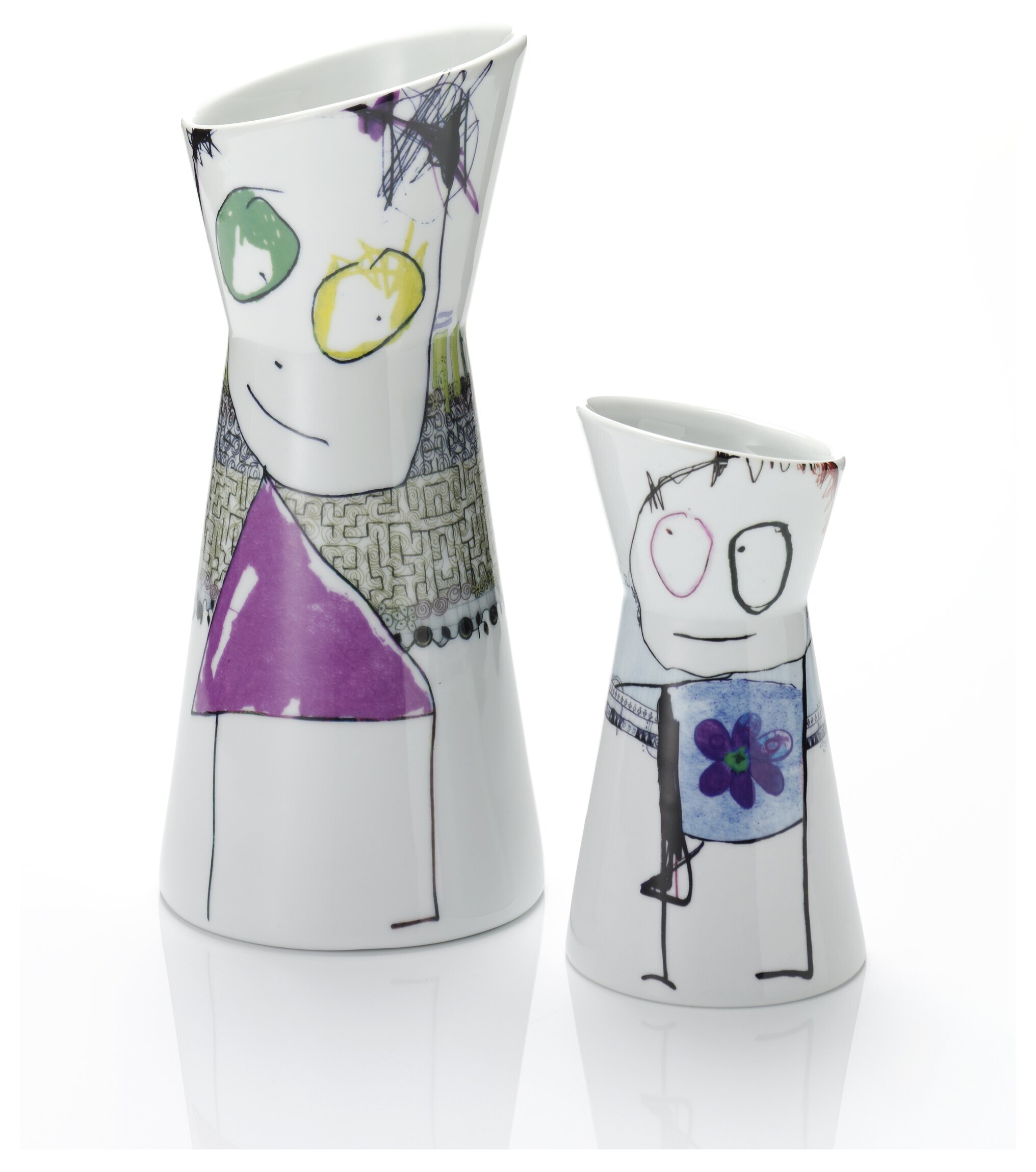 Den större karaffen har en hög, avsmalnande form som gradvis vidgas mot toppen. Ytan pryds av en färgglad illustration som täcker en stor del av karaffen. De handritade figurerna är centrala och ger ett unikt uttryck. En av karaktärerna har stora, färgglada ögon i grönt och gult som tycks få produktens yta att leva. Den stora halsen på karaffen ger en lyxig känsla och är både funktionell och estetiskt tilltalande. På den nedre halvan finns ett invecklat mönster i grått och vitt, vilket skapar ett intressant kontrastspel mot de livfulla färgerna ovanför.