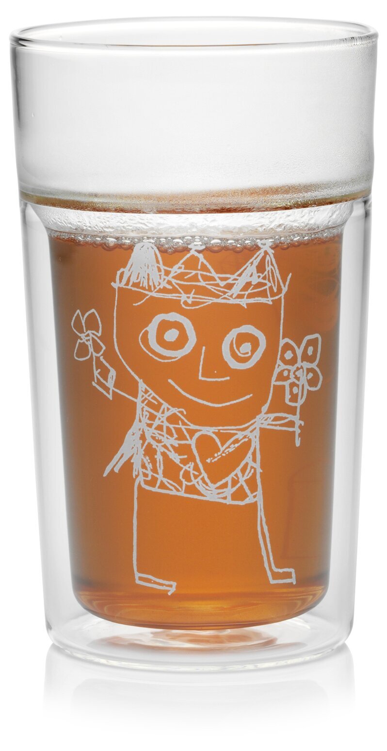 Innerglaset rymmer en bärnstensfärgad vätska, vilket framhäver den eleganta dubbelväggade konstruktionen. Genom glasets yta löper en konstnärlig teckning i vitt, typisk för Poul Pavas unika stil. Teckningen föreställer en figur med stora, runda ögon och ett brett leende. Figuren håller i en blomma, vilket ger glaset en lekfullt konstnärlig känsla. De linjära strecken skapar en trevlig kontrast mot den släta glasytan och den varma tonen av vätskan inuti.