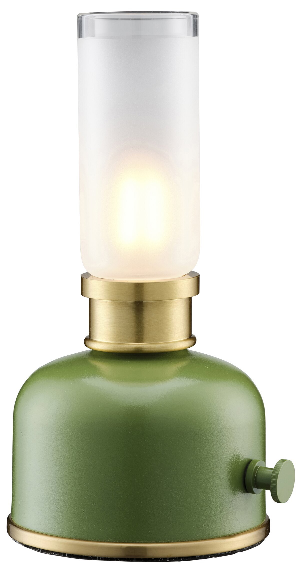 Ovanpå den gröna lampkroppen sitter ett cylinderformat parti i mässing, snarlik i färg med listen vid foten, vilket ger en sammanhållen känsla mellan lampans olika sektioner. Den här mellandelen är tillverkad i ett material som påminner om borstad metall, vilket framhäver strukturen och ger ett litet skuggspel mot det ljusare glaset ovanför.