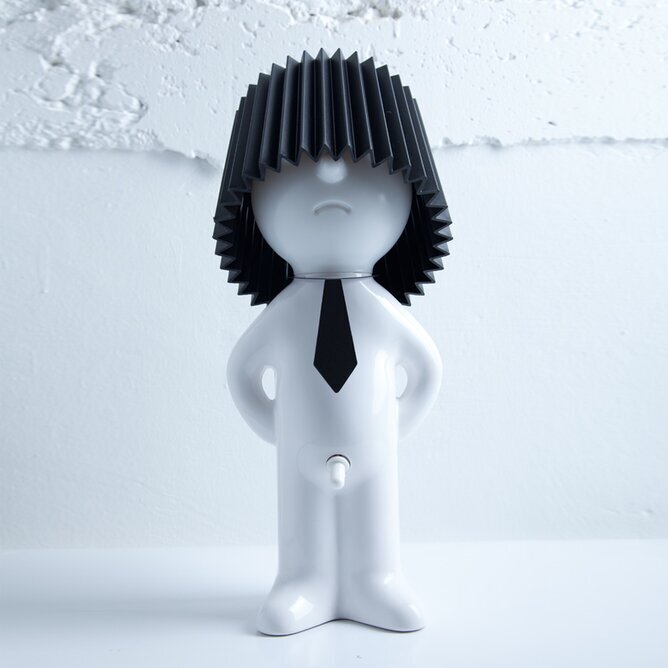 Huvudet på figuren är täckt av en draperad, svart, veckad struktur som påminner om en skämtsam frisyr eller hatt. Denna särskilda detalj ger en lekfull och kreativ twist åt designen, vilket gör produkten både uppseendeväckande och minnesvärd. Ansiktet är enkelt med små upphöjda ögon och en diskret mun, vilket bidrar till en neutral men ändå uttrycksfull uppsyn.