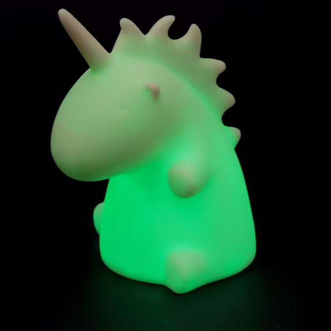 Bilden visar en nattlampa från Köpstaden.se, varumärket Puckator, utformad som en enhörning. På bilden syns enhörningen i profil, där den tydligt står ut mot en mörk bakgrund. Den lysande figuren är mjukt rundad och har en distinkt horn högst upp på huvudet. Enhörningen har en rad av små spikar eller taggar som sveper längs nacken och ryggen, vilket ger ett karakteristiskt drag av magi och fantasi.