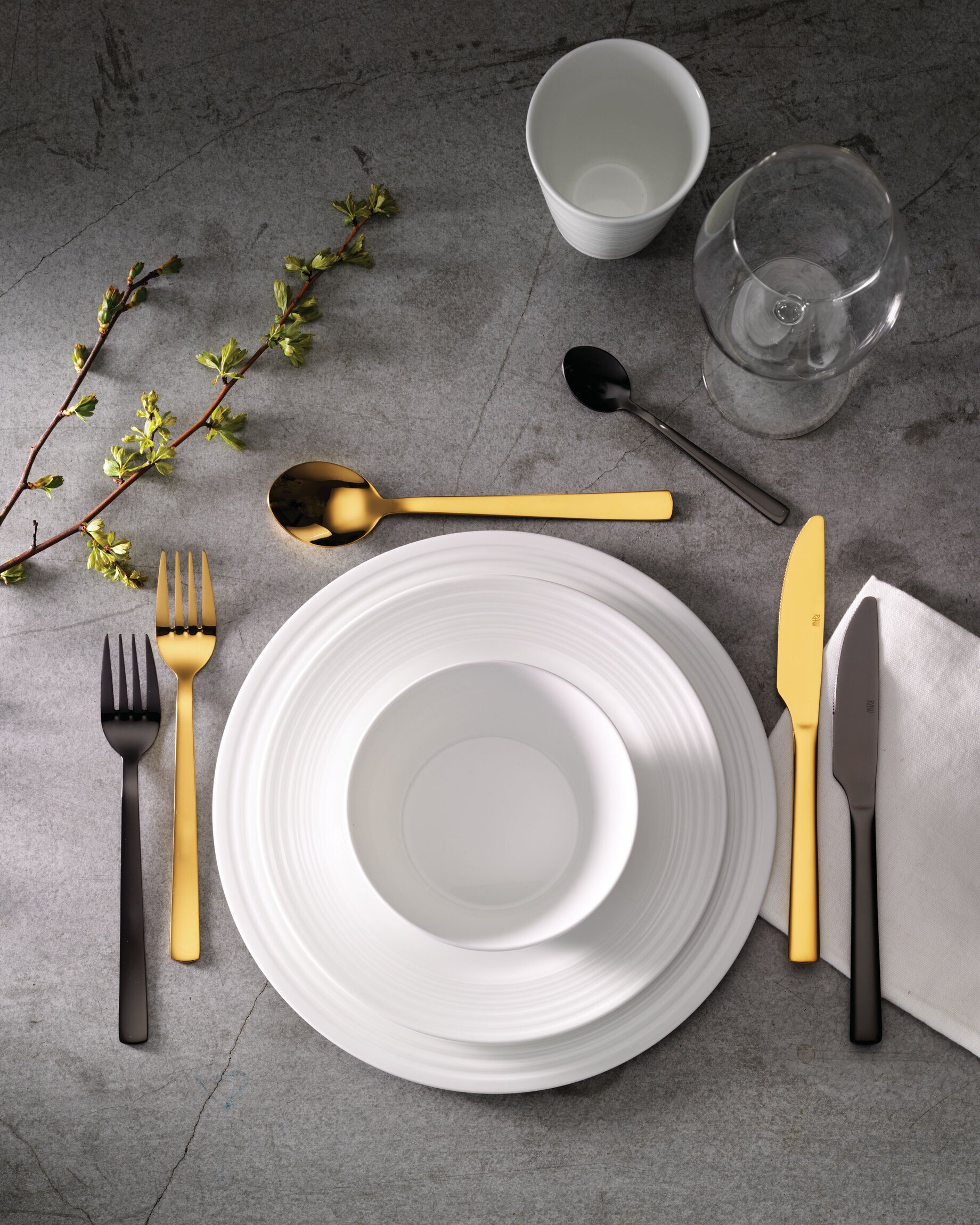 På vänster sida av servisens kant ligger en svart gaffel av metall, samsad med en gyllene gaffel. Dessa skapar en elegant kontrast mellan den dämpade och den ljusa nyansen som kompletterar varandra. Mittemot, på andra sidan tallriken, vilar två knivar – den ena i svart och den andra i guld. Deras slanka former och skarpa linjer speglar varumärket Raws moderna estetik.