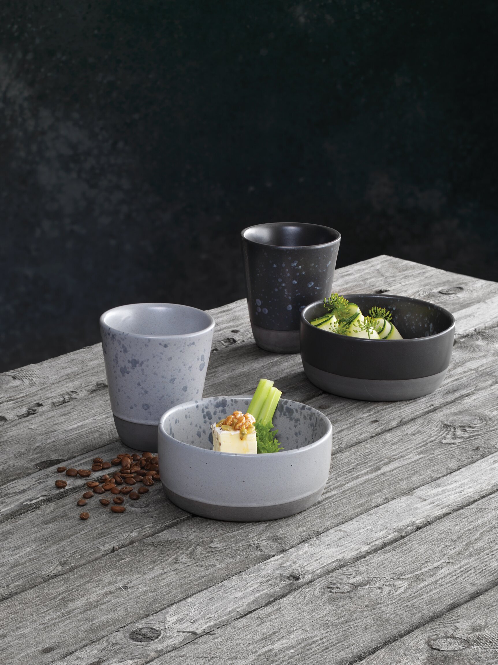 Bredvid skålen ligger en hög keramikkopp med en matchande ljusgrå färg och diskreta prickiga mönster, även denna från Raw-serien. Designen är både modern och tidlös, vilket gör dem perfekta för att servera både varma och kalla drycker. Strax intill sprider sig kaffebönor över bordsytan, och deras mörka bruna toner harmoniserar med det grå träet och de svartaktiga inslagen i kopparna.