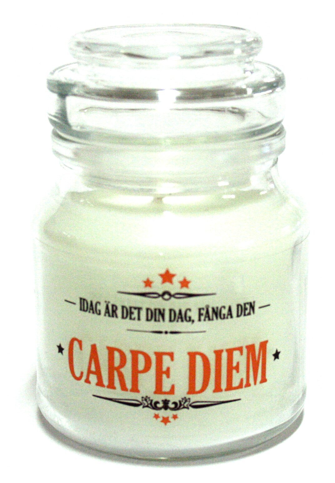 Vackert ljus i glasburk med lock utan doft. Uppskattad present, både att ge & få. Ljusets budskap "Idag är det din dag, fånga den, Carpe Diem" Mått: 10 x Ø 7 cm. Läs mer