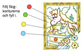 Bakom hästarna anas en landskapsbild med moln och träd, vilket ger en känsla av lugn och natur. Det finns även flera blommor i förgrunden, vilket ger ytterligare möjligheter för variation i färg och livlighet när de målas. Texten "Följ färgkonturerna och fyll i" tydliggör instruktionerna för användaren, vilket underlättar själva processen och uppmuntrar till deltagande.