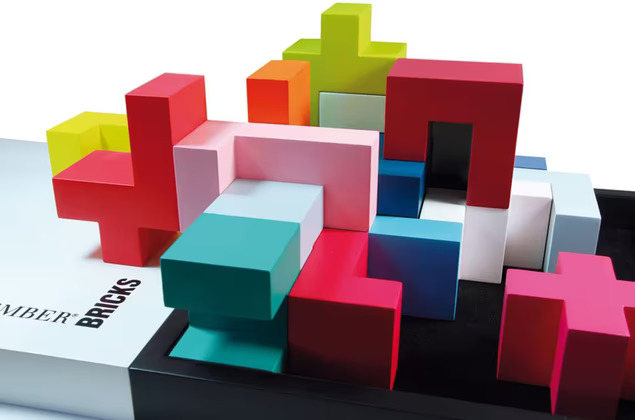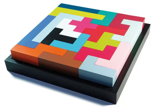 Ett spel, ett föremål, ett pussel, en skulptur, ett konstverk, en arkitektonisk struktur, en byggnad, en skapelse, en modell, en njutning, en mycket roligt, helt enkelt genial. För unga och gamla och höga och små. 18 handgjorda färgade brickor och förvaringsbox i massivt bokträ.
