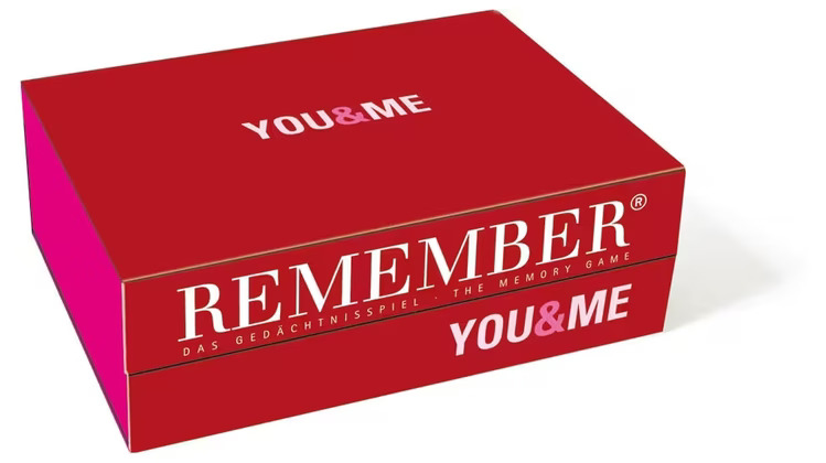 Ytan på lådan domineras av en djup, röd färg som täcker hela lådans lock. Mitt på locket står texten "You & Me" i stora vita versaler, som skapar kontrast och förstärker budskapet. Direkt under den syns varumärket Remember, också skrivet i stora versaler, men med en tydlig och distinkt typografi, vilket ger en känsla av kvalitet och pålitlighet. Denna text kompletteras med den tyska beskrivningen "Das Gedächtnisspiel" samt den engelska "The Memory Game", vilket indikerar spelets internationella karaktär och målgrupp.