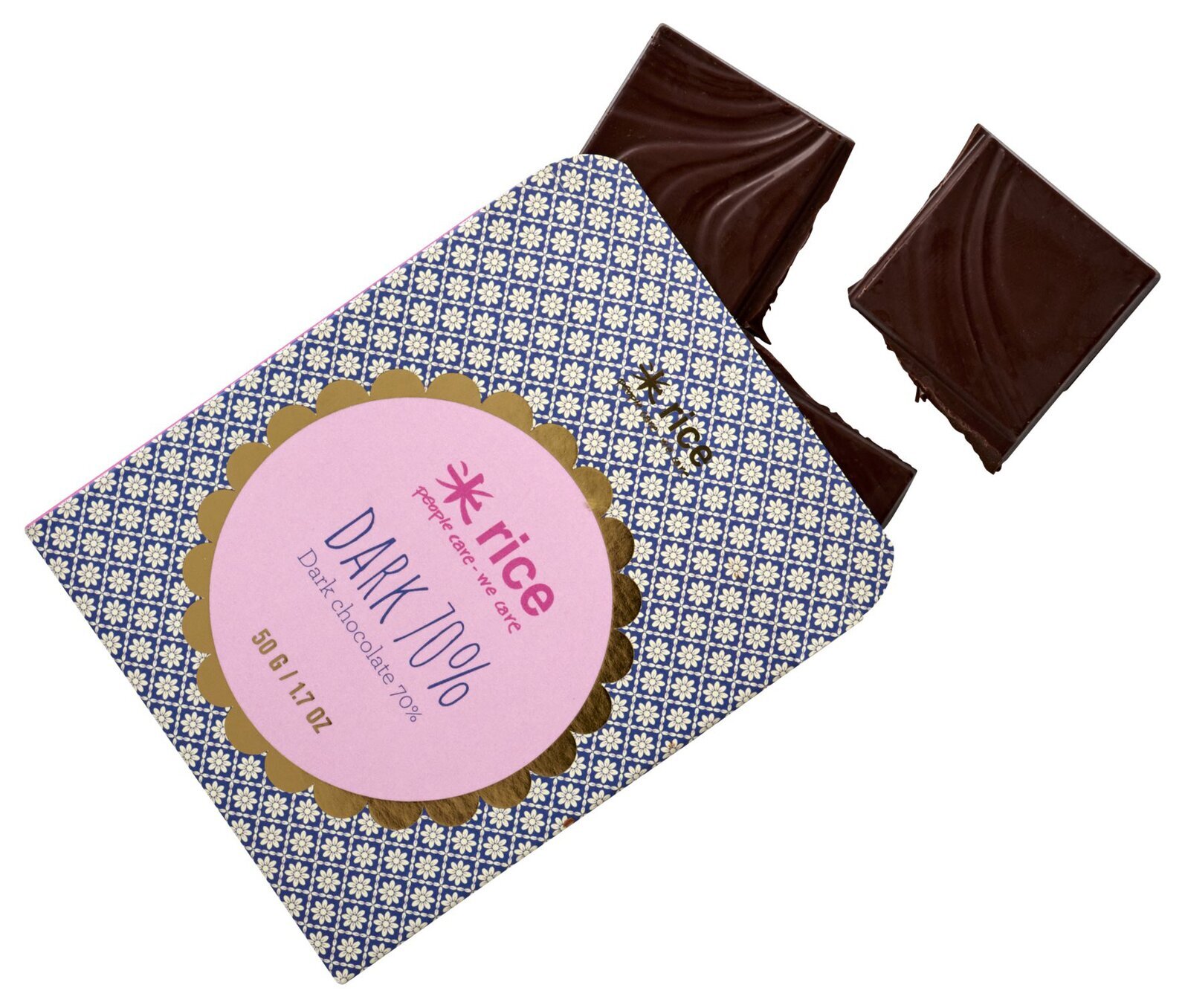 I mitten av omslaget finns en stor rosa etikett med texten "Dark 70%" tydligt tryckt i en djup lila färg. Logotypen för varumärket Rice är också tydligt placerad här, tillsammans med en liten text som informerar om produktens detaljer och innehåll. Den gyllene cirkeln runt etiketten drar uppmärksamheten till produkten, vilket gör den lätt att känna igen på butikshyllan. Denna detalj är särskilt användbar för att locka kunder i det mångsidiga sortimentet som erbjuds på Köpstaden.se.