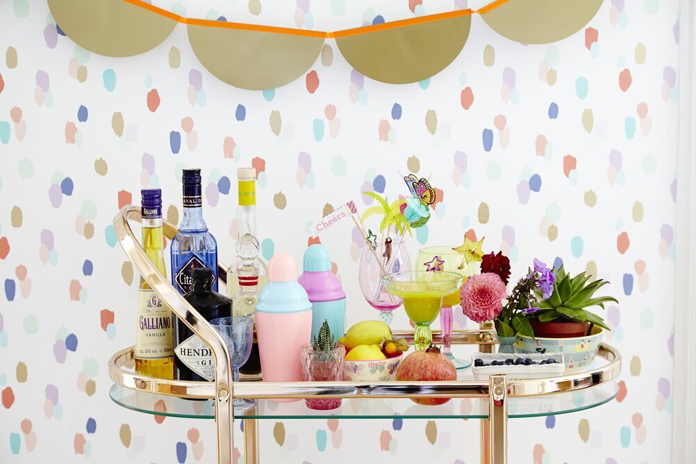 Bland dryckestillbehören ligger också olika frukter noggrant placerade, där citroner och ett granatäpple bryter av med sina livliga färger mot vagnen. Flera pappersparasoller och drinkpinnar är arrangerade i glas och skapar en tropisk stämning. Ett vinglas fyllt med en lysande limegrön cocktail står smakfullt i mitten, spetsad med en stjärnformad cocktailpinne.