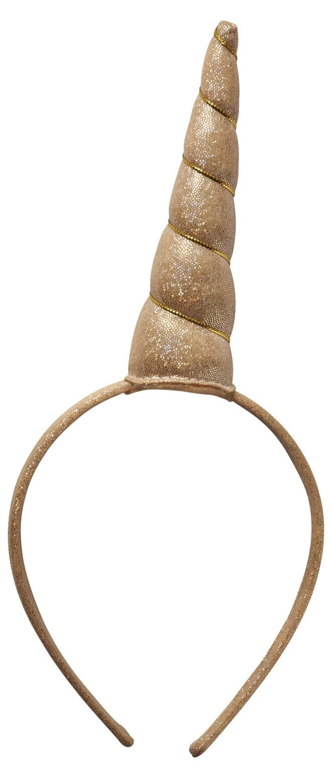 Diademet är utformat som ett enhörningshorn, som är spirallindat för att efterlikna formen av ett magiskt djur. Hornet är klätt i ett glittrande guldfärgat material som ger en skimrande effekt, vilket för tankarna till sagor och magi. Den lätt böjda formen av diademets båge säkerställer att det sitter bekvämt på huvudet och ger en stabil passform.