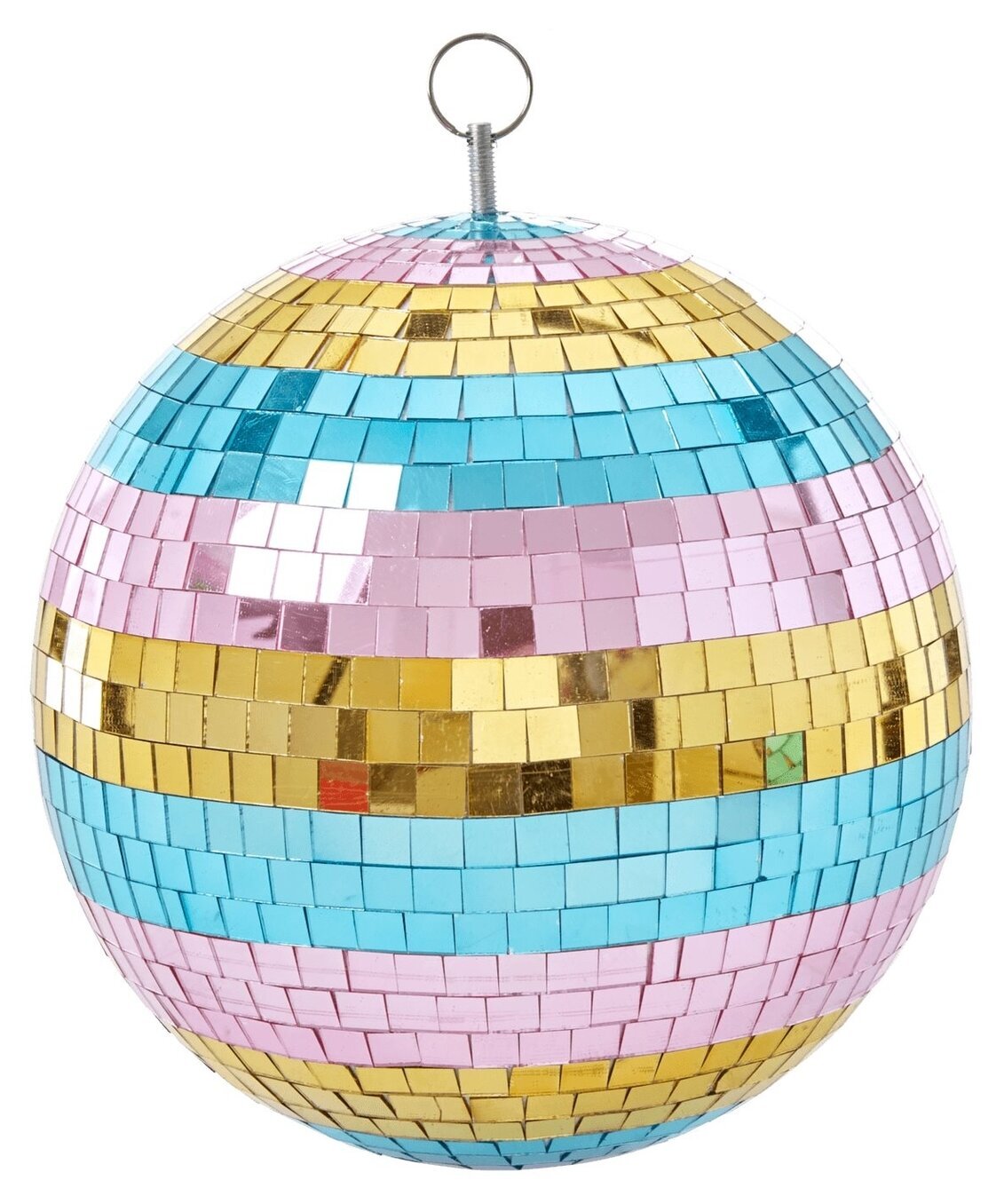 Den här bilden från Köpstaden.se visar en färgglad discoboll från varumärket Rice. Discobollen, med en diameter på 25 cm, är täckt av små fyrkantiga spegelbitar som ger den ett karakteristiskt och iögonfallande utseende. Spegelbitarna är arrangerade i olika färgade ränder: rosa, guld och blått, vilket skapar ett livligt och festligt mönster. Denna design är både lekfull och uppfriskande, vilket gör att discobollen lätt drar blickarna till sig.