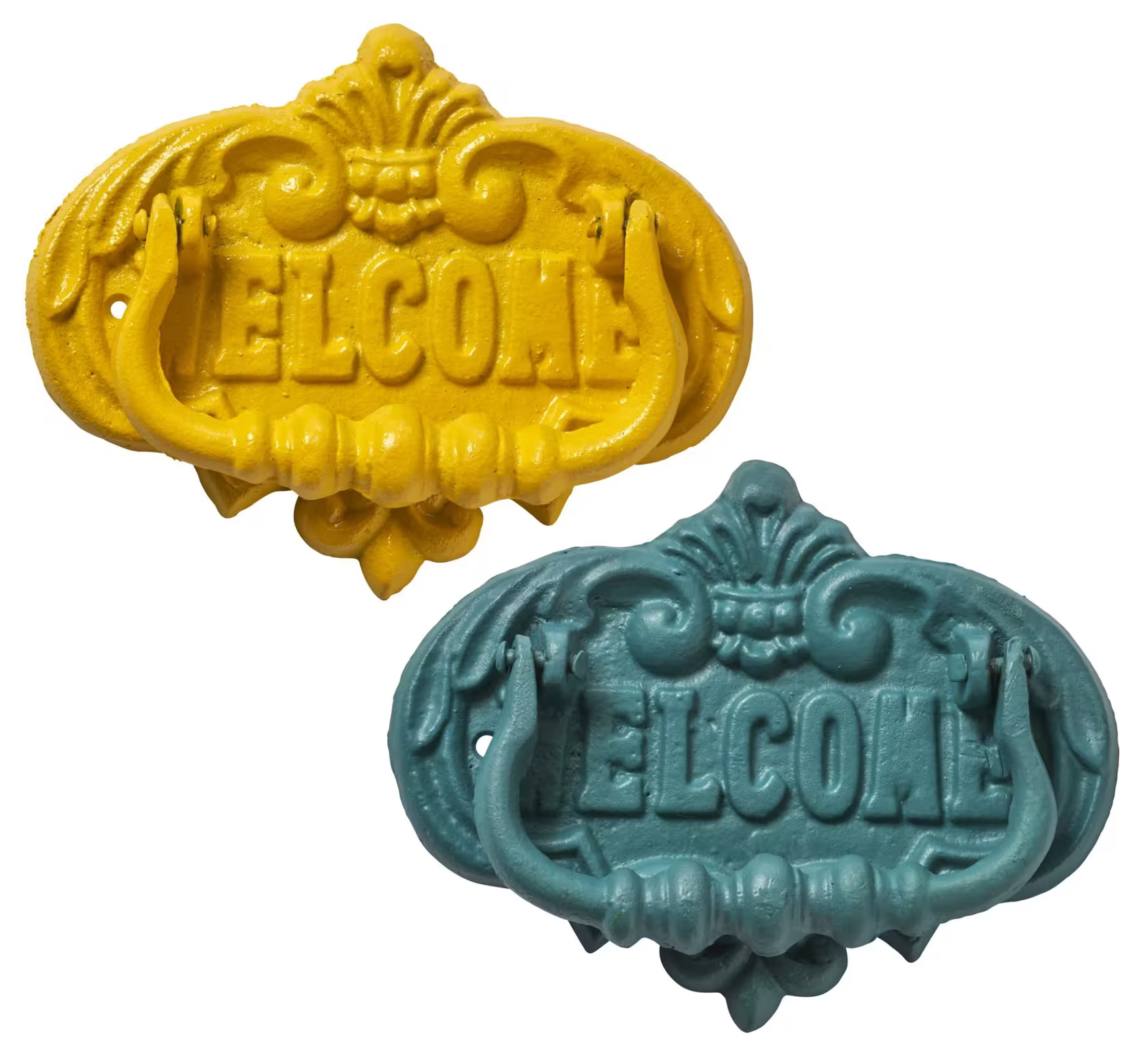Den andra dörrknackaren, i en rik grönblå färg, följer samma designprincip som den gula. Den har samma inbjudande meddelande, "WELCOME", och liknande ornamentala inslag. Det blommiga mönstret på toppen är tydligt och ger en känsla av elegans och tradition. Hantaget är likaså praktiskt utformat för användning, med jämna linjer som bidrar till både funktionalitet och estetik.