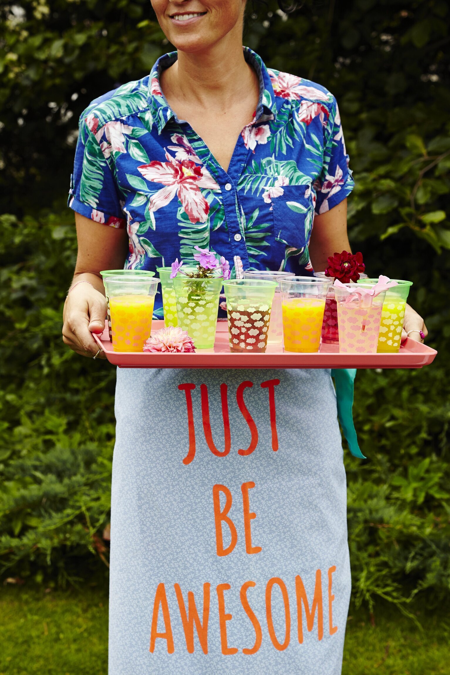 Personen håller en bricka fylld med plastglas i olika färger och mönster, troligtvis fyllda med olika drycker. En närmare titt avslöjar att glasen är prytt med små vita moln, vilket adderar en lekfull dimension till presentationen. Vid sidan av dryckesglasen syns dekorativa blommor i olika färger såsom rosa och rött, vilket ytterligare förstärker intrycket av en festlig och inbjudande tillställning.