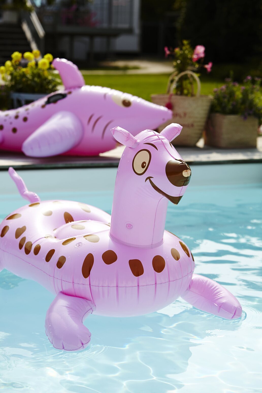 Bilden från Köpstaden.se visar en idyllisk scen med två uppblåsbara leksaker i form av djur, flytandes i en solbelyst pool. I förgrunden syns en humörfylld, lila uppblåsbar figur med svarta prickar jämnt fördelade över kroppen. Den är utrustad med fyra lemmar och ett framträdande huvud, vilket bidrar till dess lekfulla utseende. Denna produkt, från märket Rice, fångar verkligen intresset med dess livfulla design och glada uttryck.
