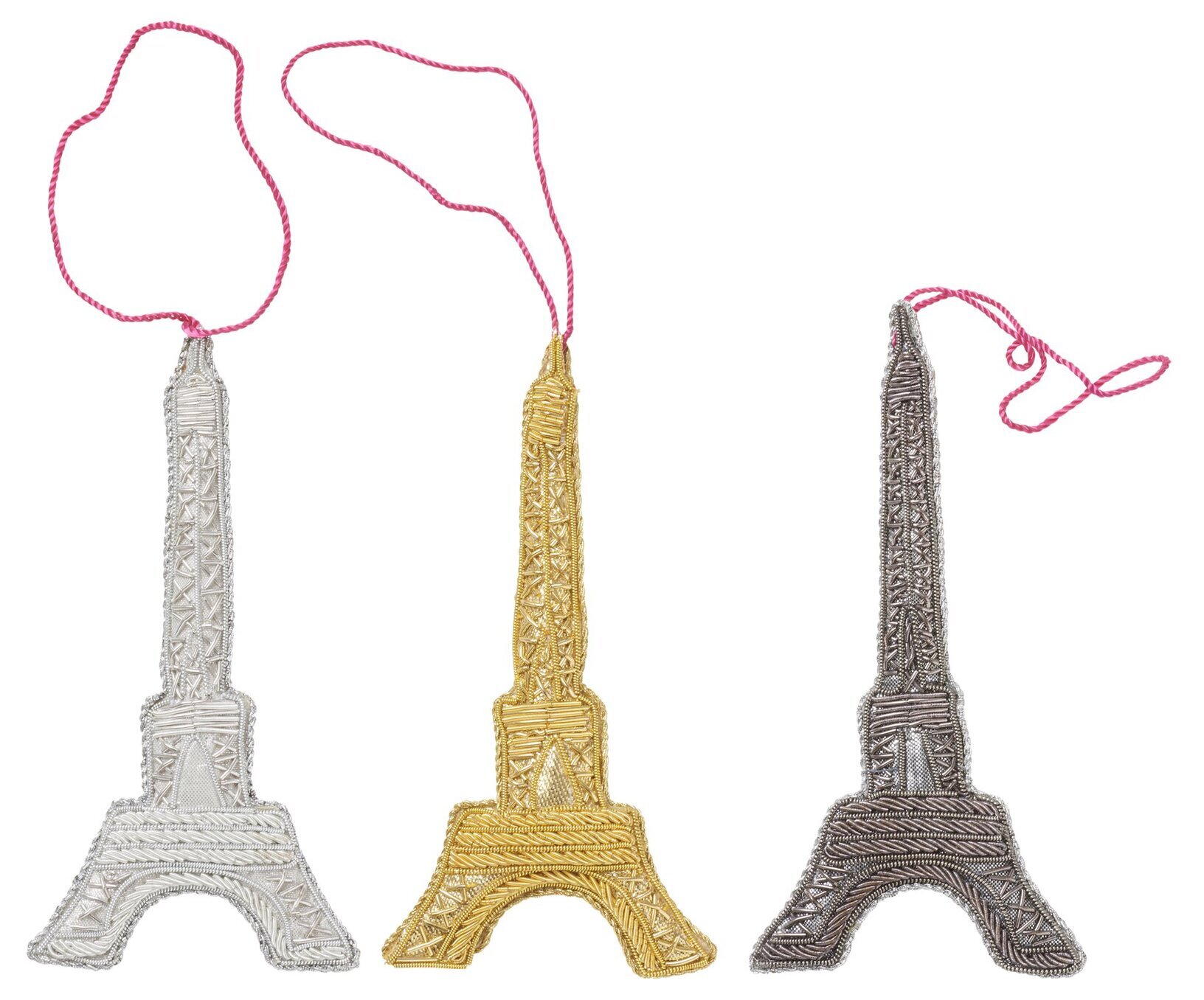 Till vänster finns en Eiffeltornsprydnad i en elegant silvrig nyans. Det fina, detaljerade mönstret i materialet ger en känsla av intrikat hantverk. Dekorationen är försedd med en stilfull hänganordning i form av ett rosafärgat snöre, vilket gör det enkelt att fästa den i granen eller var helst man önskar pryda sitt hem.