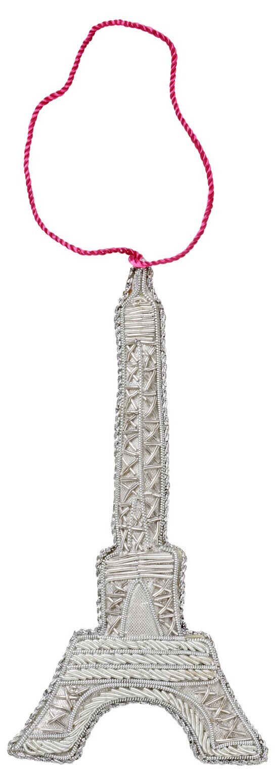 Dekorationen är formad som det välkända Eiffeltornet och har en lyxig och gnistrande yta i en metallic nyans. Materialet ser ut att vara bearbetat med precision för att efterlikna tornets ikoniska struktur. De utsirade detaljerna liknar de stålkonstruktioner som utmärker Eiffeltornet, och skapar en känsla av äkthet och noggrannhet. På tornets yta ser vi ett intrikat mönster av broderade linjer och cirklar, vilket ytterligare bidrar till den genomarbetade stilen.