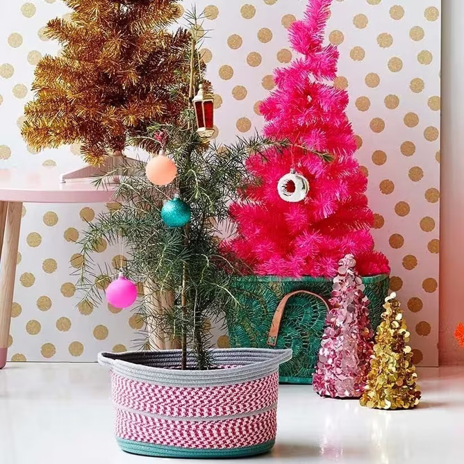 Bilden visar en livfull och färgglad scen där den centrala delen utgörs av en Julgran Neon Pink från varumärket Rice. Denna konstgjorda gran är placerad i vad som verkar vara en stickad, grön korg på golvet. Dess neonrosa färg står ut mot den ljusa bakgrunden och får granen att bli ett slående inslag i rummet. Bakgrunden är dekorerad med en tapet i vitt med gyllene, prickiga mönster som ger en festlig känsla.