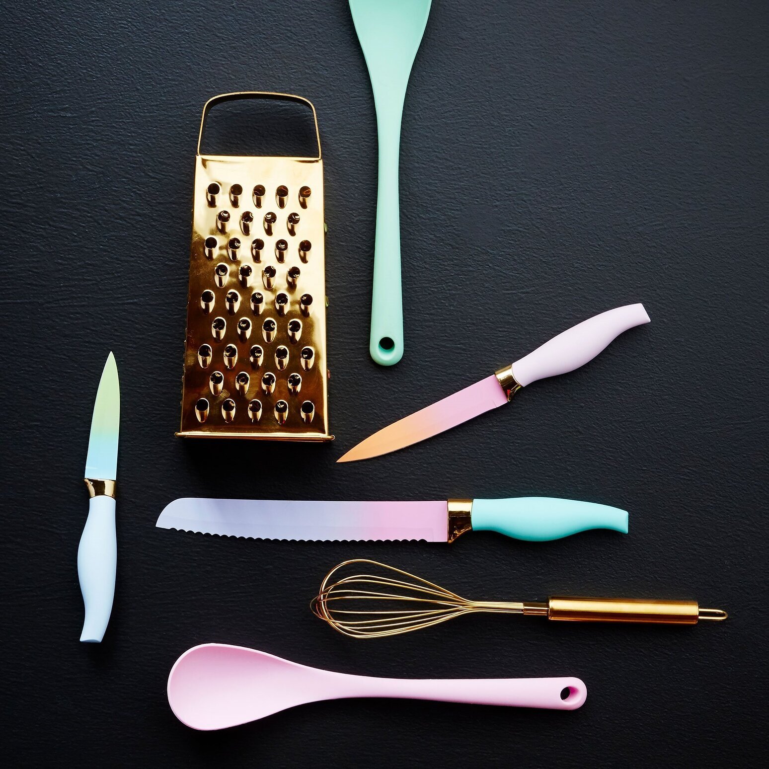 Nedanför rivjärnet, i bilden, finns två knivar. Den första är en brödkniv med ett tandat blad, perfekt för att skära genom knapriga bröd utan att förstöra dess textur. Denne följs tätt av en universalkniv, från Rice, som har ett rosa blad och är försedd med ett bekvämt handtag i en pastellgrön nyans. Denna kniv verkar vara både praktisk och mångsidig, en fantastisk komponent för den som älskar att laga mat.