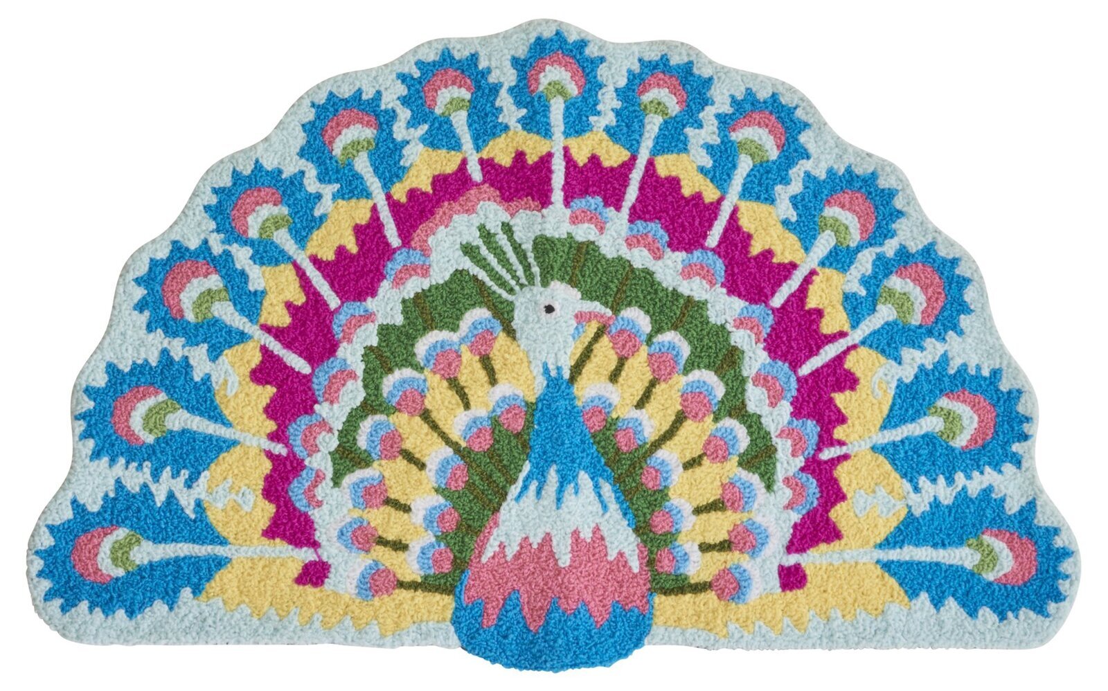 Vacker påfågelmatta i en alldeles underbar färgkombination från Rice, tillverkad i 80% akryl och 20% polyester. Gummerad baksida så mattan ligger på plats och ej halkar iväg.