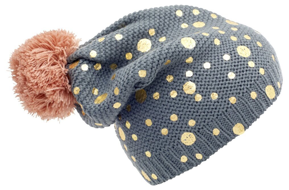 Bilden från Köpstaden.se visar en grå stickad mössa från varumärket Rice. Denna huvudbonad bjuder på en intressant och iögonfallande design, perfekt för den kyligare säsongen. Mössan har en mjuk, grå färg som bas, vilket kombineras med unika dekorativa element. Utspridda över hela mössans yta syns flera gyllene prickar i olika storlekar. Dessa gulddetaljer tillför ett livfullt och lekfullt inslag till det annars dämpade plagget, vilket gör att det både sticker ut och kompletterar en neutral garderob.
