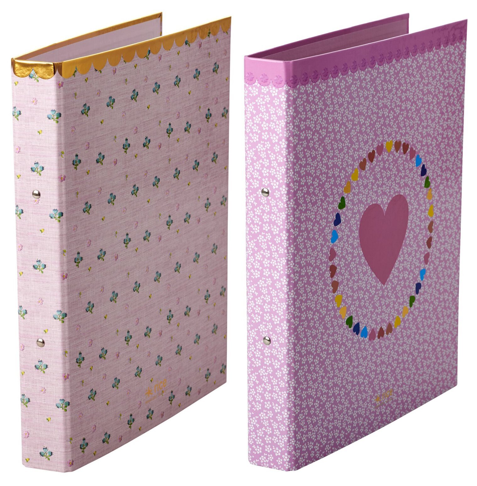 På bilden från Köpstaden.se syns två A4-pärmar från varumärket Rice. Dessa produkter är utformade för att ge en praktisk och stilren lösning för dina dokument- och pappersförvaringsbehov. Den vänstra pärmen på bilden har en lätt rosa basfärg dekorerad med ett subtilt mönster av små, färgglada blommor spridda över ytan. Blommorna framträder i olika färger, inklusive blått och rosa, vilket ger ett lekfullt intryck. Pärmarnas kanter är prydda med en glänsande guldfärgad kant som löper längs överdelen, vilket tillför en elegant kontrast till den matta bakgrunden.