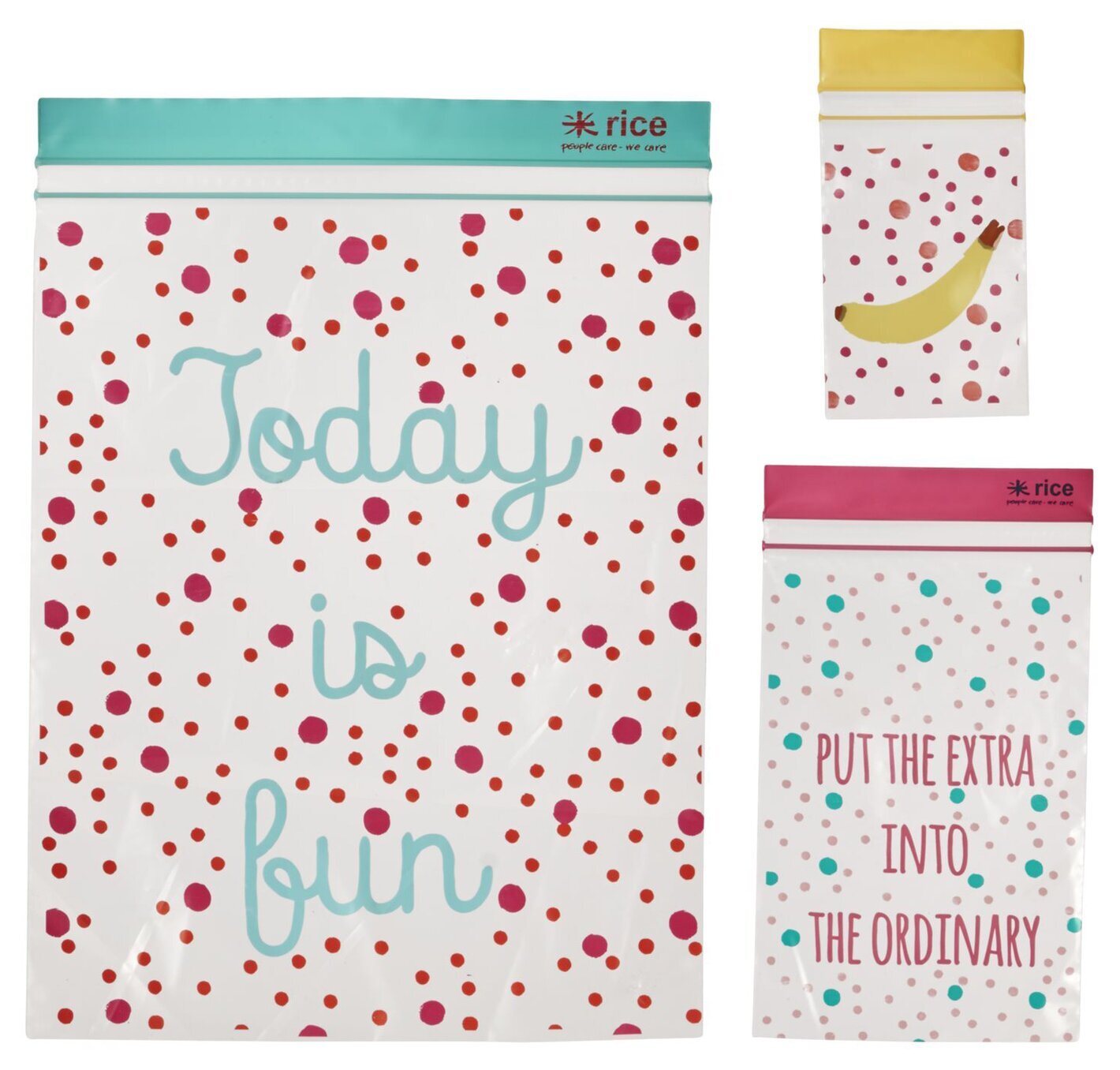 Den största påsen dominerar bilden med sin turkosa dragkedja högst upp. På denna påse kan man se en text i ljusblå bokstäver, "Today is fun", som står ut mot bakgrunden av röda prickar i olika storlekar. Det skapar en livfull kontrast och drar blicken till sig.
