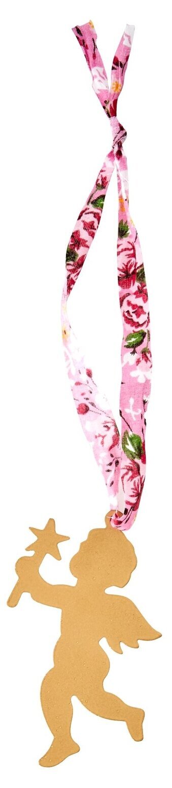 Hänget är fäst vid ett band, vilket gör det enkelt att hänga prydnaden i olika miljöer. Bandet består av ett livfullt tyg i rosa nyanser med ett blomstrande mönster, där mönstret består av olika nyanser av rosa och gröna blad, vilket skapar en harmonisk kontrast till den bronzeliknande ängeln. Bandet är knutet i en enkel knut högst upp, vilket ger en praktisk fästpunkt för dekorationen och samtidigt tillför en mjuk, estetisk detalj.