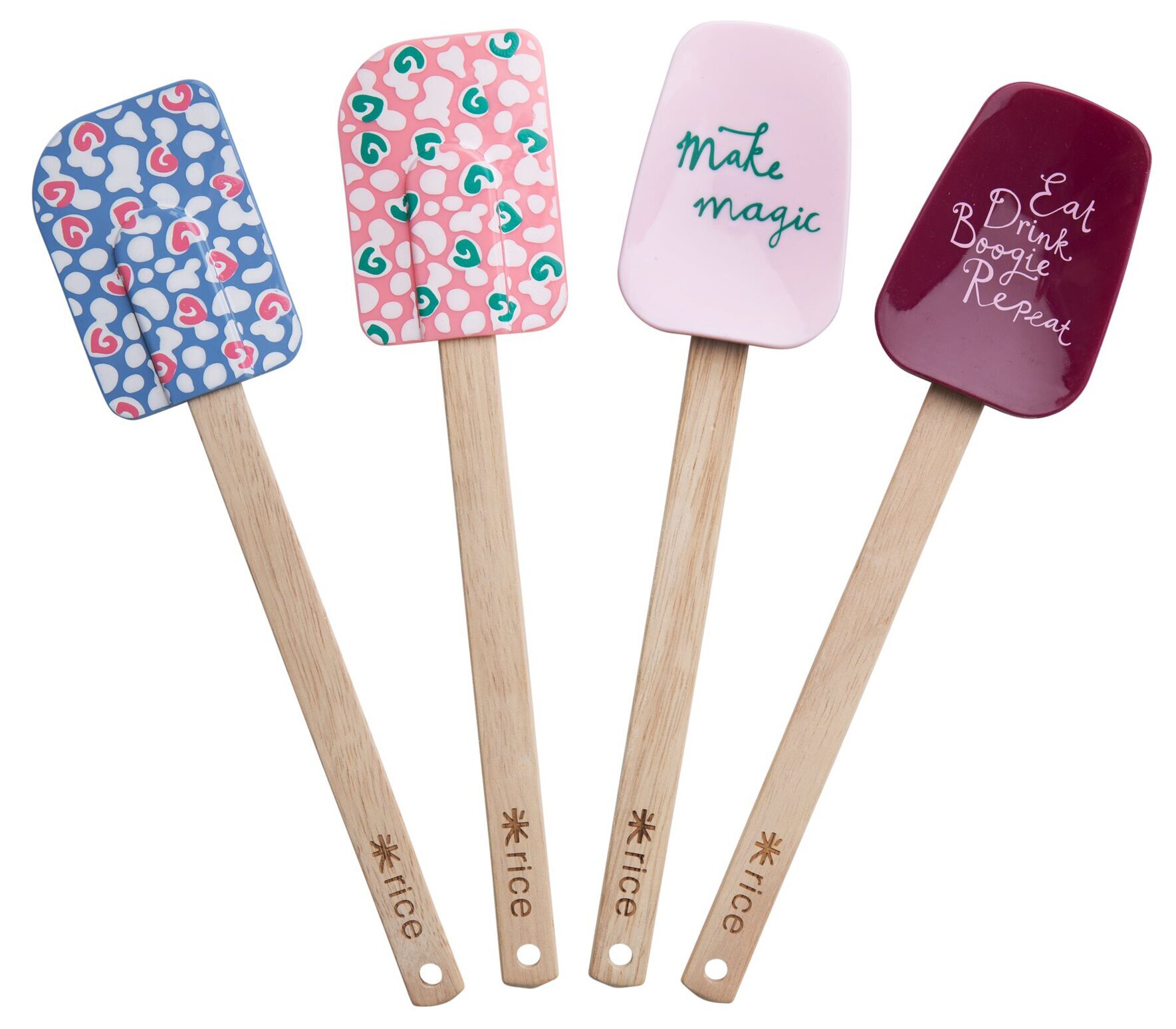 Bilden föreställer en uppsättning av fyra slickepottar från produktserien Slickepott Boogie Prints av varumärket Rice, vilket är tillgängligt hos den mångsidiga butiken Köpstaden.se. Varje slickepott har ett unikt motiv eller budskap på silikonbladet, vilket ger både färg och inspiration i köksarbetet.