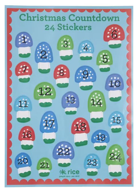 Bilden från Köpstaden.se visar en färgglad och lekfull samling av stickers från varumärket Rice, designade som en julkalender för att räkna ner dagarna till jul. Som en del av sortimentet hos Köpstaden.se erbjuder denna produkt en rolig och interaktiv upplevelse för barn och vuxna som ser fram emot nedräkningen till jul.