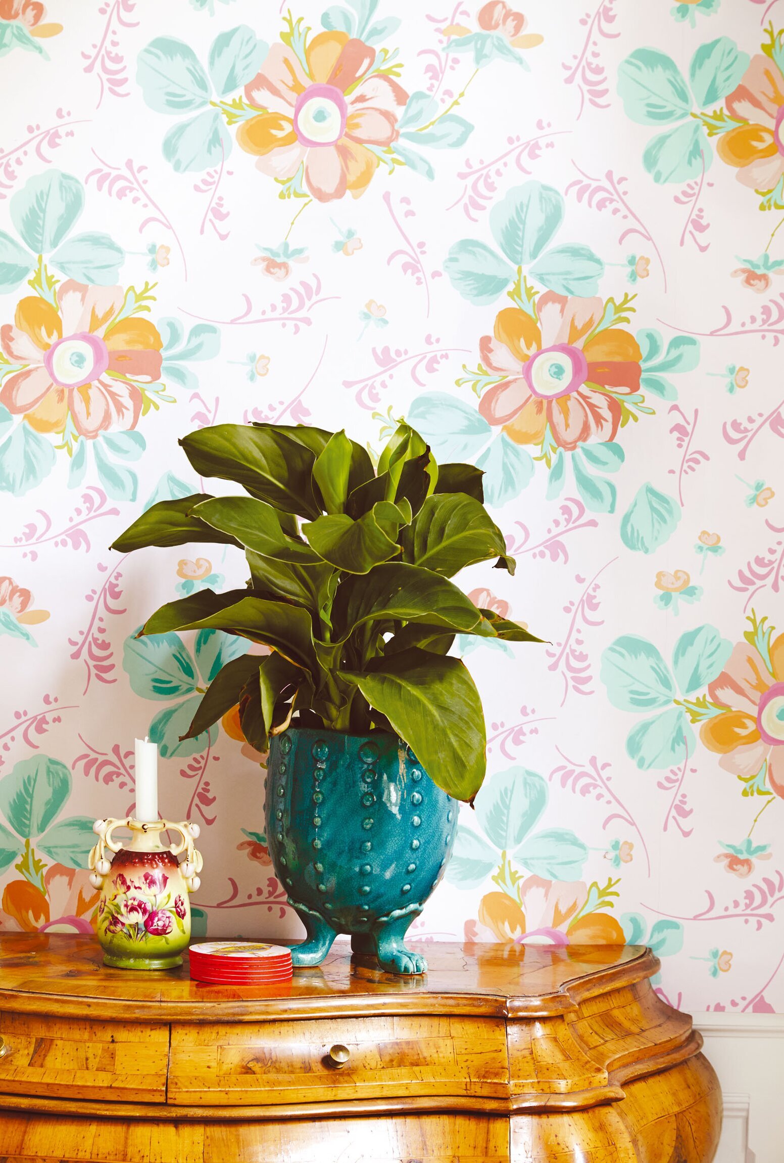 Det som verkligen sätter stämningen i bilden är tapeten från kollektionen Rice. Den pryds av stora, stiliserade blommönster i mjuka pastellfärger inklusive rosa, orange och ljusblått. Dessa blommor ramas in av slingrande löv och kvistar som skapar en känsla av rörelse och livlighet på väggen. Denna tapet är ett exempel på hur Rice-märket infuserar sin design med färgsprakande och lekfulla element som för med sig glädje in i ett rum.
