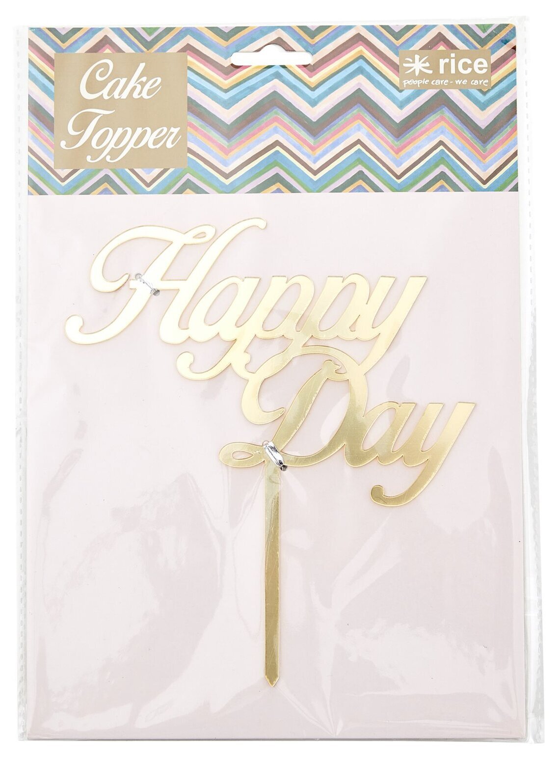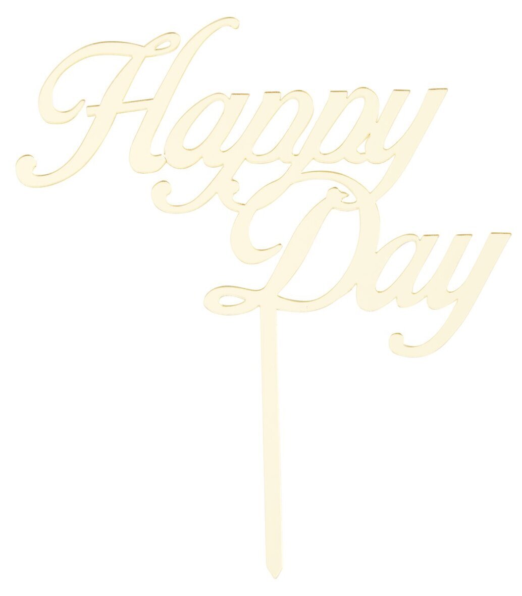 Tårtdekoration att fästa på toppen med texten Happy Day i skinande guld. Mått: 17 x 15 cm.