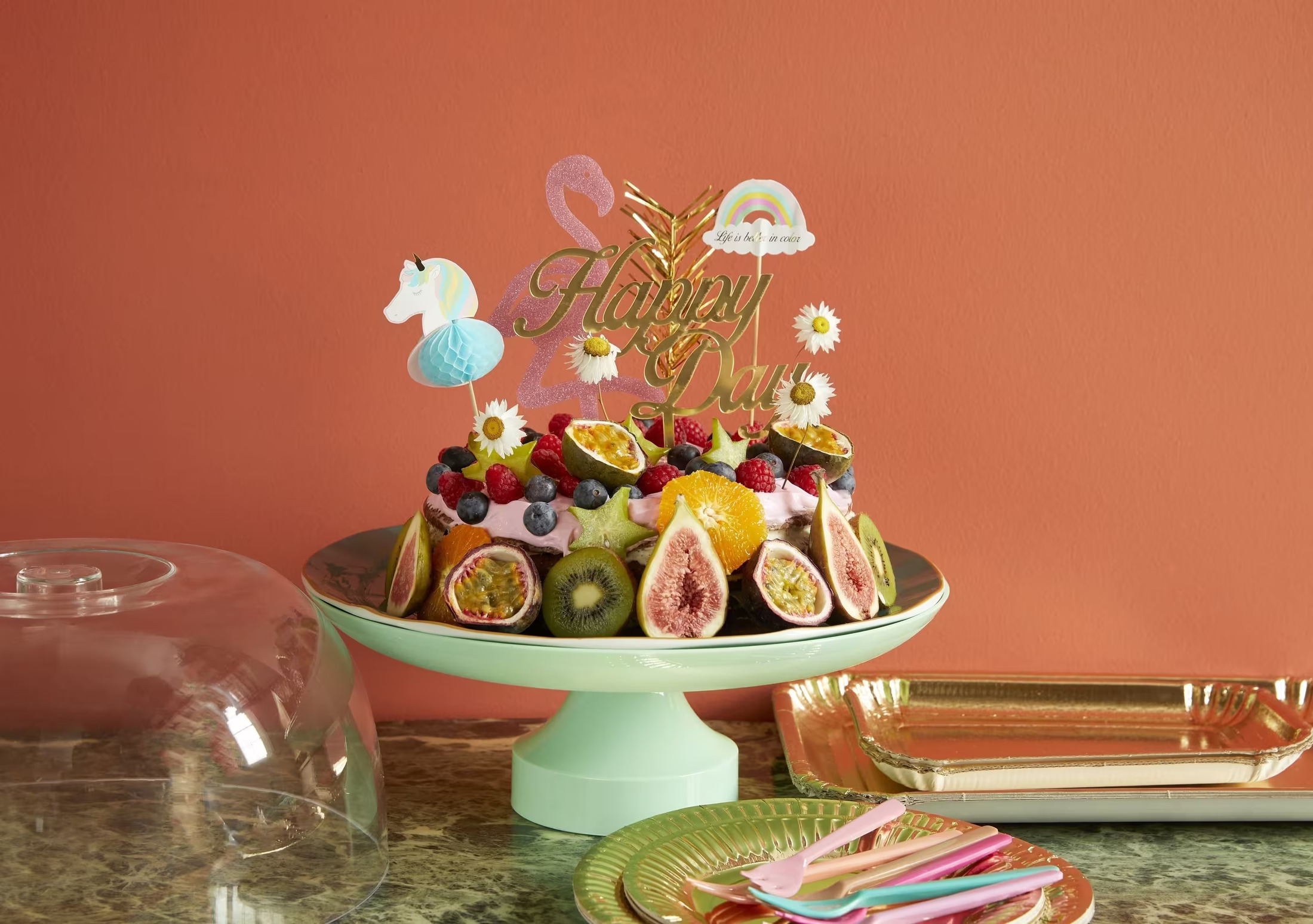 Tårtan står på ett elegant, mintfärgat tårtfat med en ren och stilren design. Bordet som tårtfatet står på har en marmorliknande yta, vilket ger ett sofistikerat intryck och ger en snygg bakgrund till de livliga färgerna på tårtan. Bredvid tårtfatet syns en genomskinlig tårtlock i plast, vilket skyddar skapelsen innan servering.