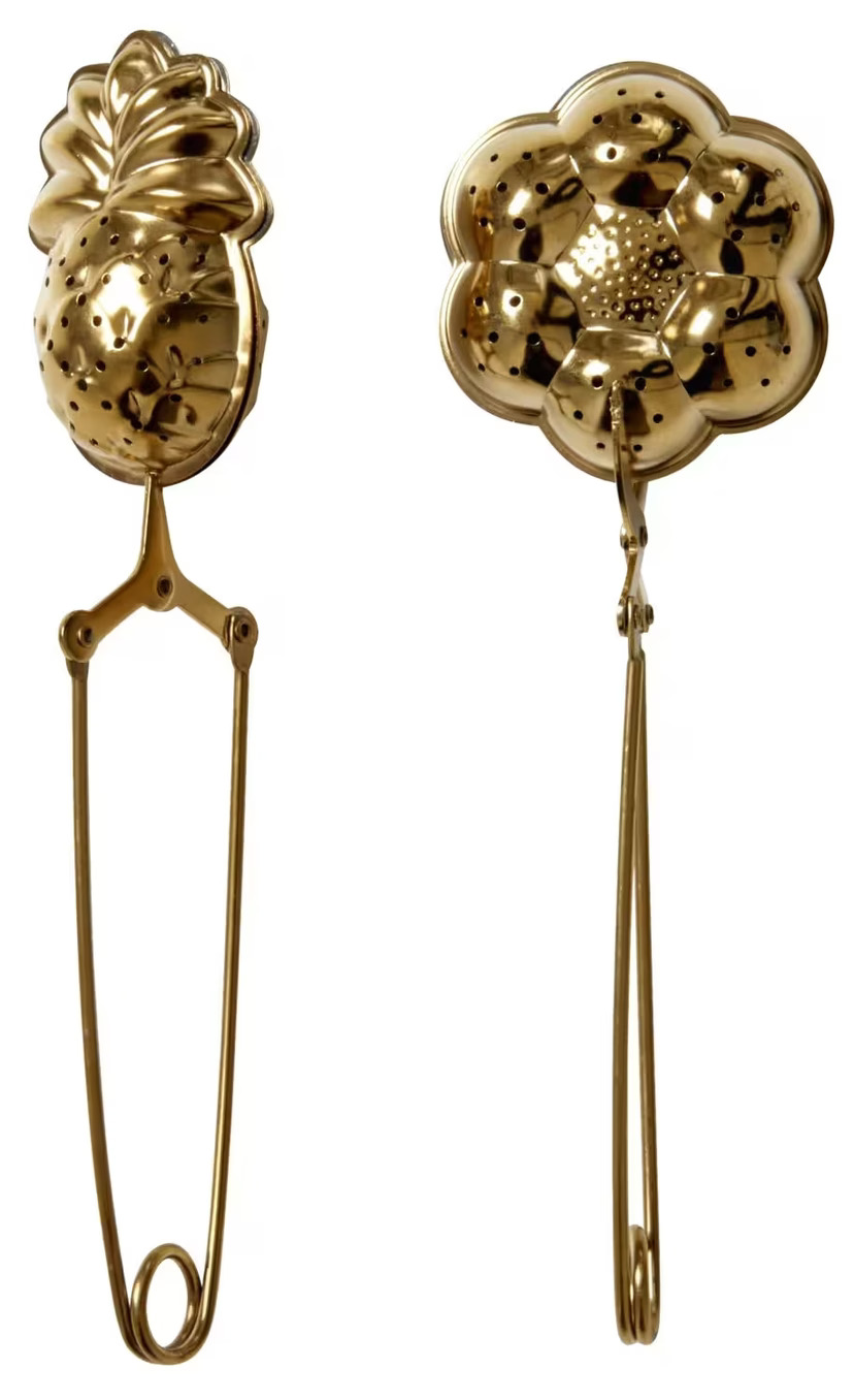 Bilden visar en tesil i guld från Köpstaden.se, med varumärket Rice, och är formad som en ananas, vilket genast fångar ögat. Denna tesil kombinerar funktion och design på ett uppseendeväckande sätt. Ananasens yta är slät och glänsande med en rad små hål jämnt fördelade över hela fruktkroppen, vilket möjliggör effektiv bryggning av teblad. Detaljerna på bladen och kronan av ananasen är välgjorda, vilket ger ett distinkt tredimensionellt intryck.
