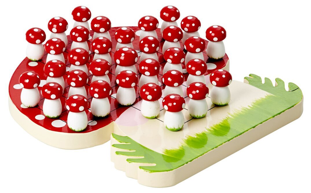 De spelpjäser som används i detta Solitär-spel är formade som små flugsvampar. Deras huvuden är klarröda med jämnt fördelade vita prickar, vilket förstärker svampestetiken. Själva stammen av varje svamp är vit, vilket skapar en naturtrogen och fantasifull design.