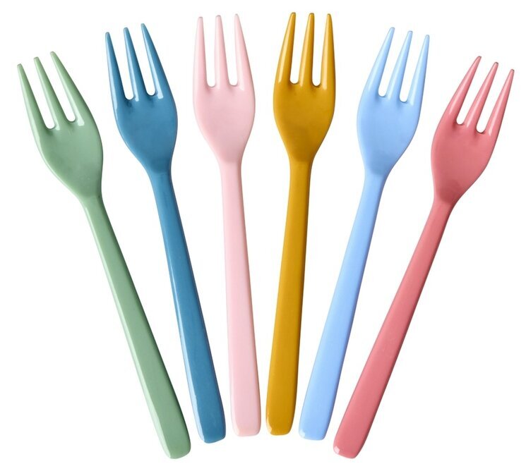 Färgglada små gafflar som sätter guldkant på fikastunden. Perfekta till helgens tårta, fruktsalladen eller till charkbrickan. Setet innehåller 6 gafflar i lekfulla färger från Rice. Tillverkade i slitstark melamin – idealiska för både vardag och fest.