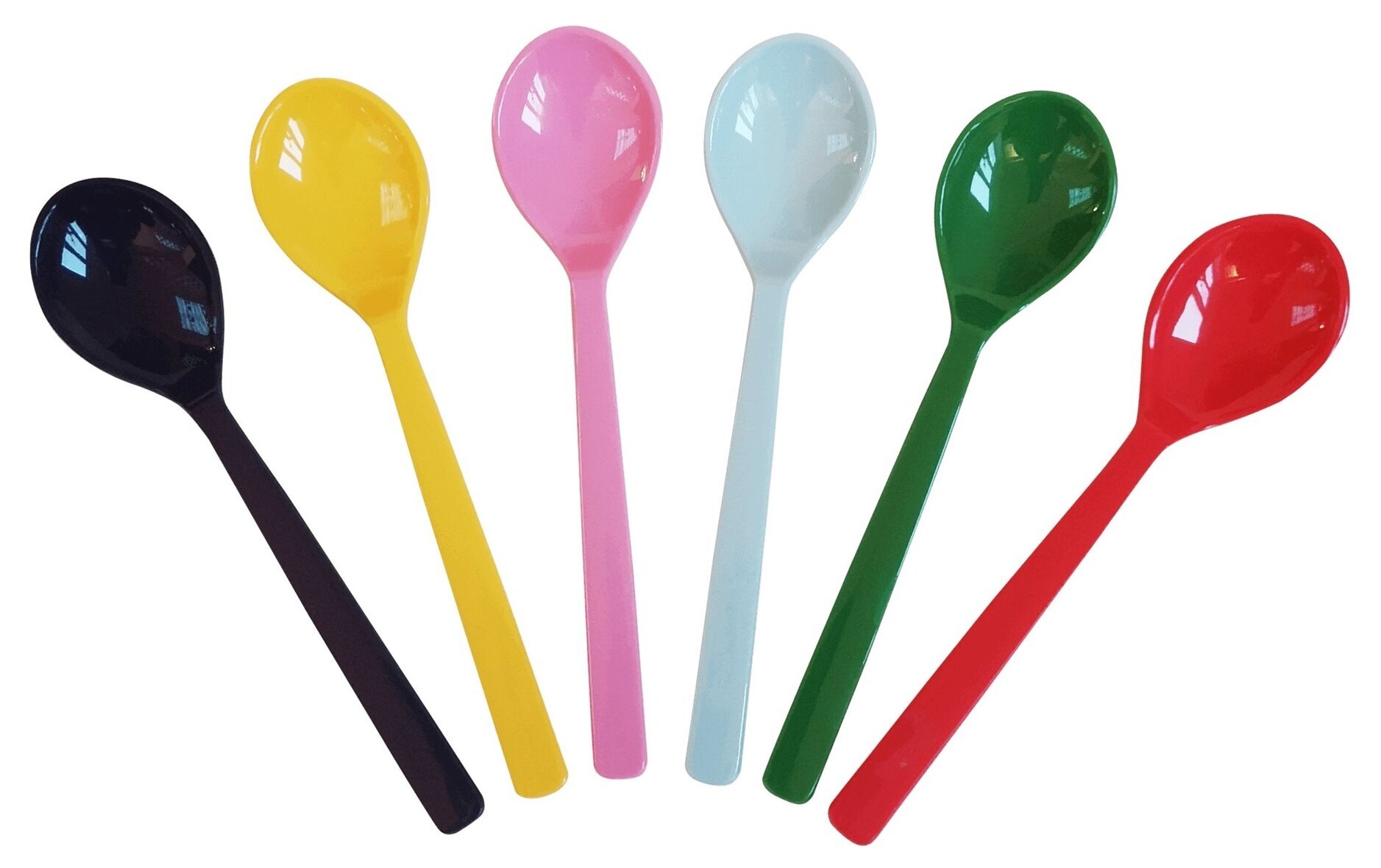 Set om 6 stycken slitstarka & tåliga korta skedar av melamin i härligt färgglada nyanser från Rice. Komplettera gärna med muggar & tallrikar i matchande färger. Godkänd för livsmedel.