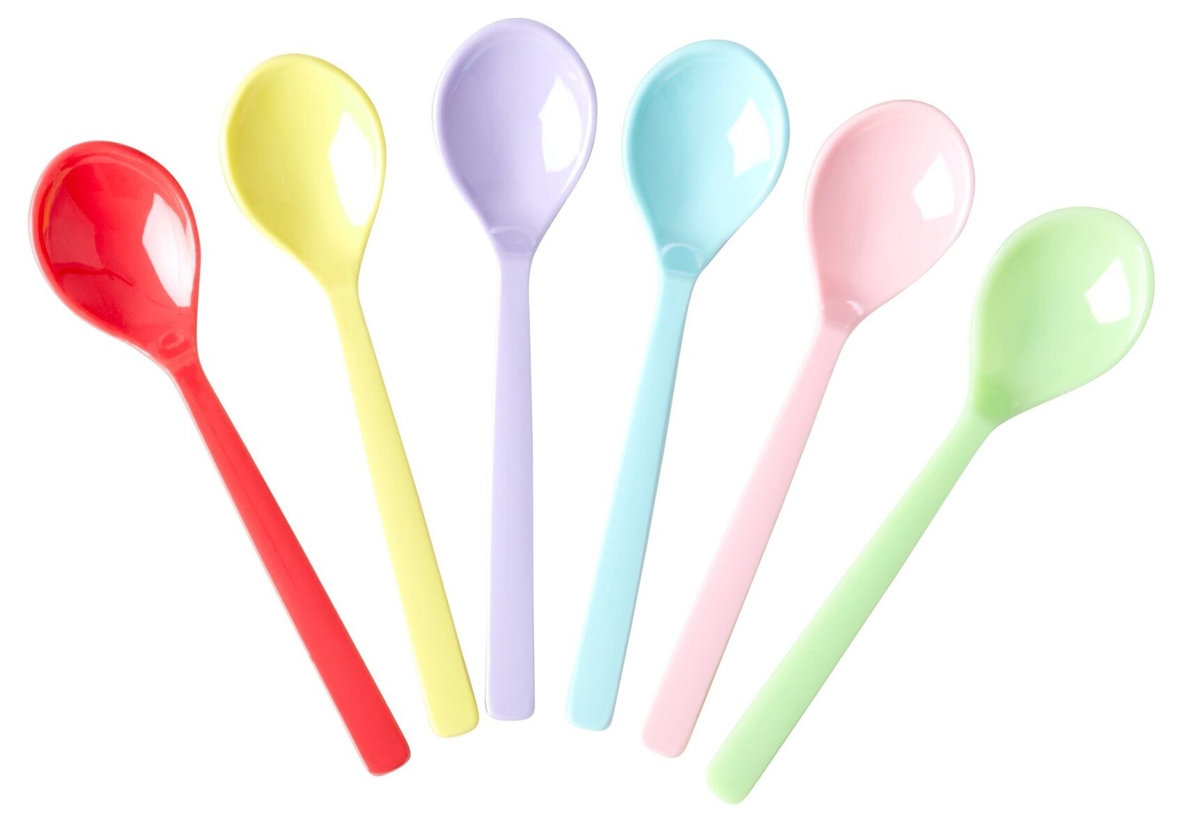 Set om 6 stycken slitstarka & tåliga korta skedar av melamin i härligt färgglada nyanser från Rice. Komplettera gärna med muggar & tallrikar i matchande färger. Godkänd för livsmedel.