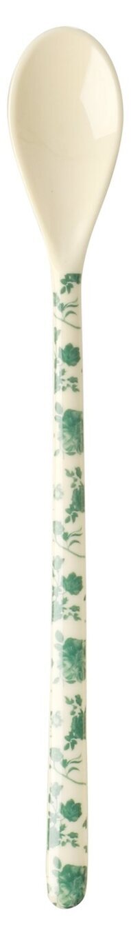 Den långa skeden har en slät, benvit skål, vars yta reflekterar ljuset på ett subtilt sätt, vilket ger en uppfattning om dess glansiga finish. Denna yta gör att skeden både är lätt att rengöra och behaglig att använda. Handtaget är dekorerat med ett detaljerat mönster bestående av gröna blommor och blad som sträcker sig längs hela dess längd. Det botaniska mönstret är både modernt och tidlöst, vilket skapar en harmonisk känsla av natur på bordet.