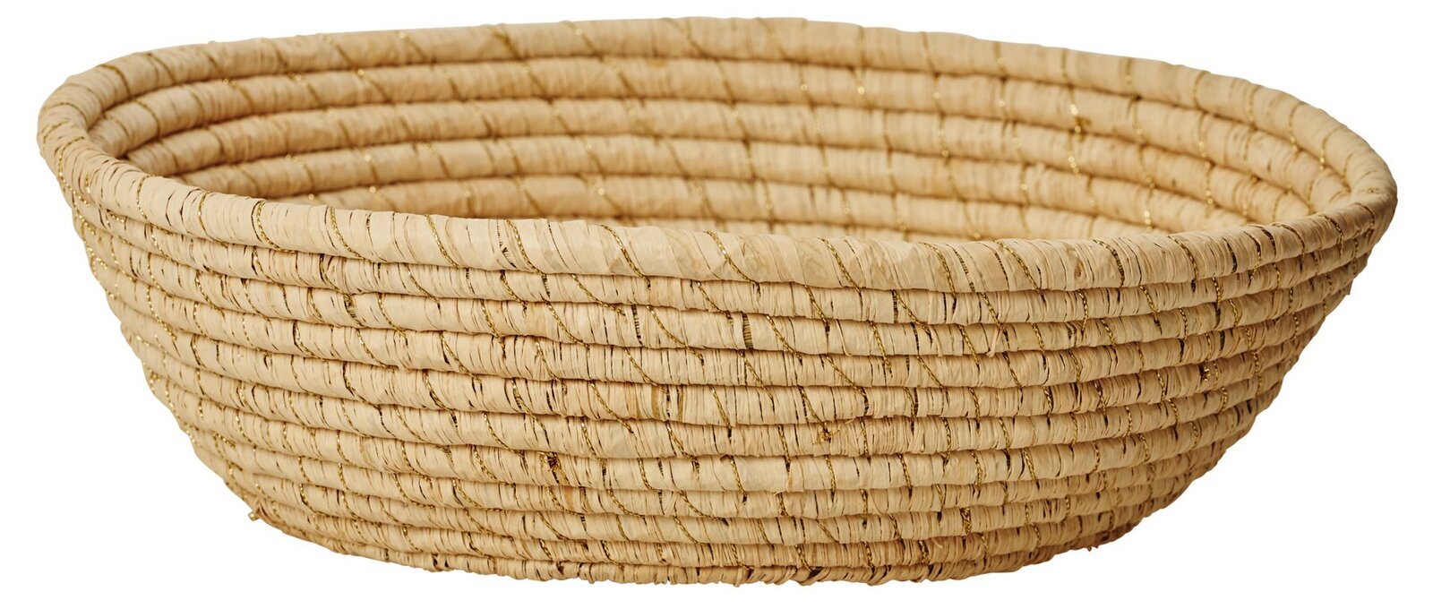 Dessa vackra raffiakorgar med guldtråd kan användas både som brödkorgar, smyckeskorgar eller varför inte förvara nycklar och annat som man har liggandes framme. Korgarna är tillverkade av raffiafiber som kommer från palmblad från Madagaskar.