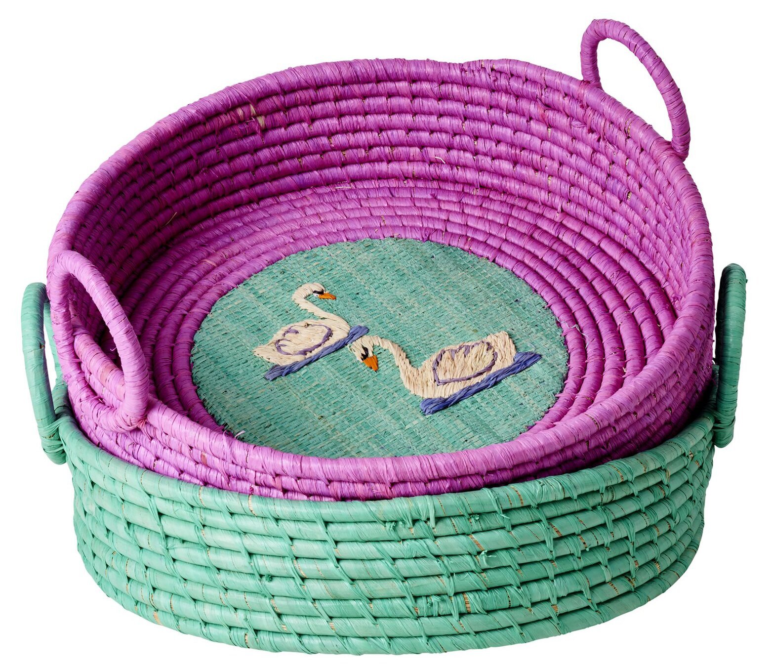 Bilden visar en rund brödkorg från Köpstaden.se, en mångsidig butik som tillhandahåller ett omfattande urval av vardagsprodukter. Denna brödkorg, från varumärket Rice, är utformad med både funktionalitet och estetik i åtanke. Korgen har en slående färgpalett, där de yttre sidorna är flätade i en livlig grön nyans medan insidan uppvisar en djup lila ton. Färgerna kontrasterar vackert och skapar en visuell dimension som fångar ögat.