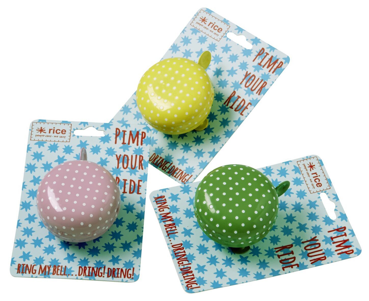 Bilden visar tre cykelklockor från Rice, en del av sortimentet på Köpstaden.se. Dessa klockor är tillverkade i livliga pastellfärger som genast fångar ögat. Varje cykelklocka har ett unikt, prickigt mönster som ger en lekfull och glad känsla. De tre färgerna som visas är rosa, gul och grön, vilket ger en mångsidig palett som kan passa olika smakpreferenser.