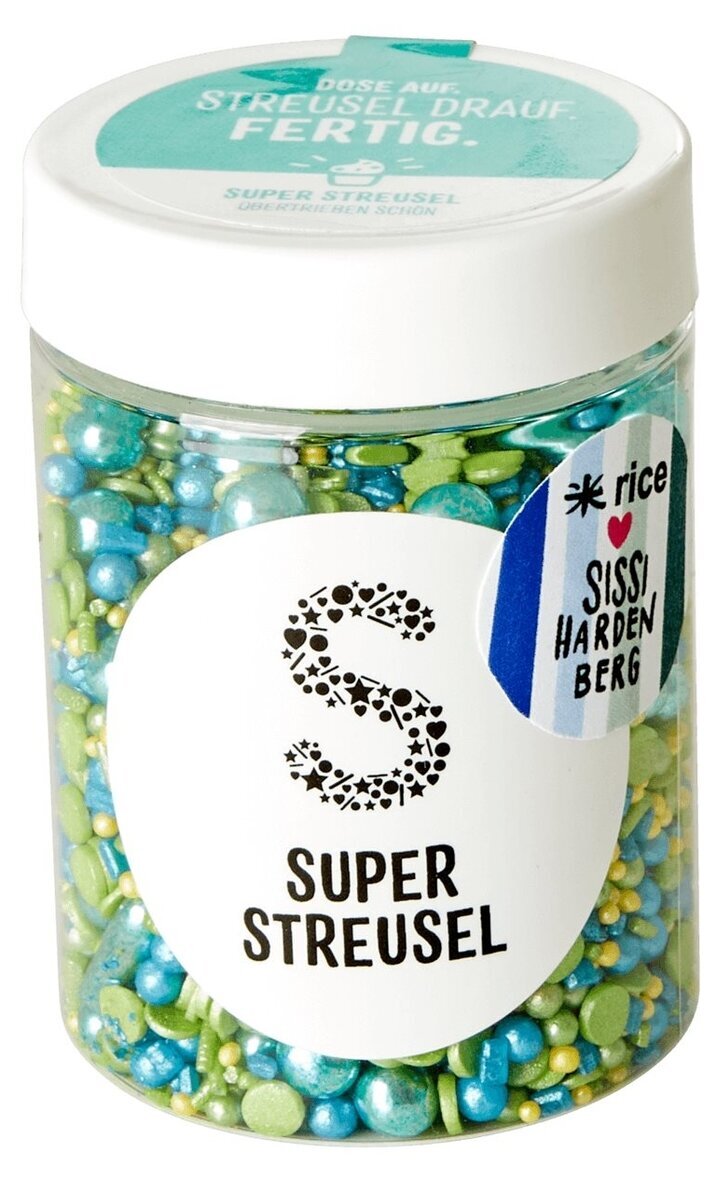 Lockets ovansida är i en ljusblå ton med text på som lyder "Dose auf: Streusel drauf. Fertig." i vita bokstäver. Burkens etikett är stilfullt designad, med en stor bokstav "S" dekorerad med små ikoner såsom hjärtan och stjärnor, som bidrar till en lekfull känsla. Under denna bokstav står namnet "Super Streusel" i djärva svarta bokstäver.