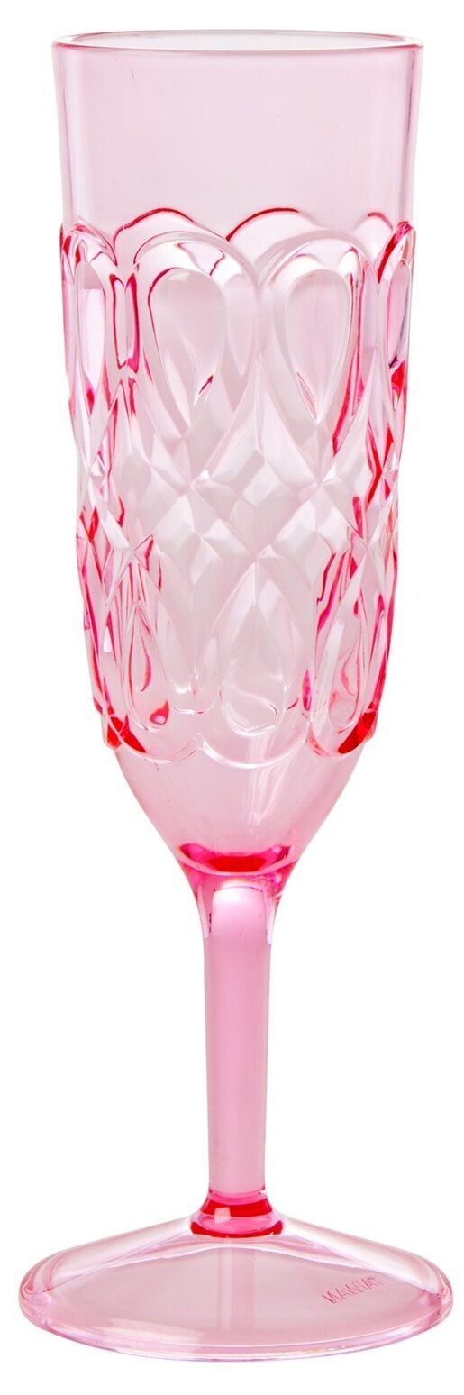 På bilden ser vi ett champagneglas från Köpstaden.se, benämnt Champagne Glas Swirly Pink. Detta glas, tillverkat av märket Rice, präglas av sin unika design och framträdande färg. Glaset är format i en delikat rosa nyans som genast fångar blicken, vilket gör det till ett iögonfallande inslag på varje dukning.