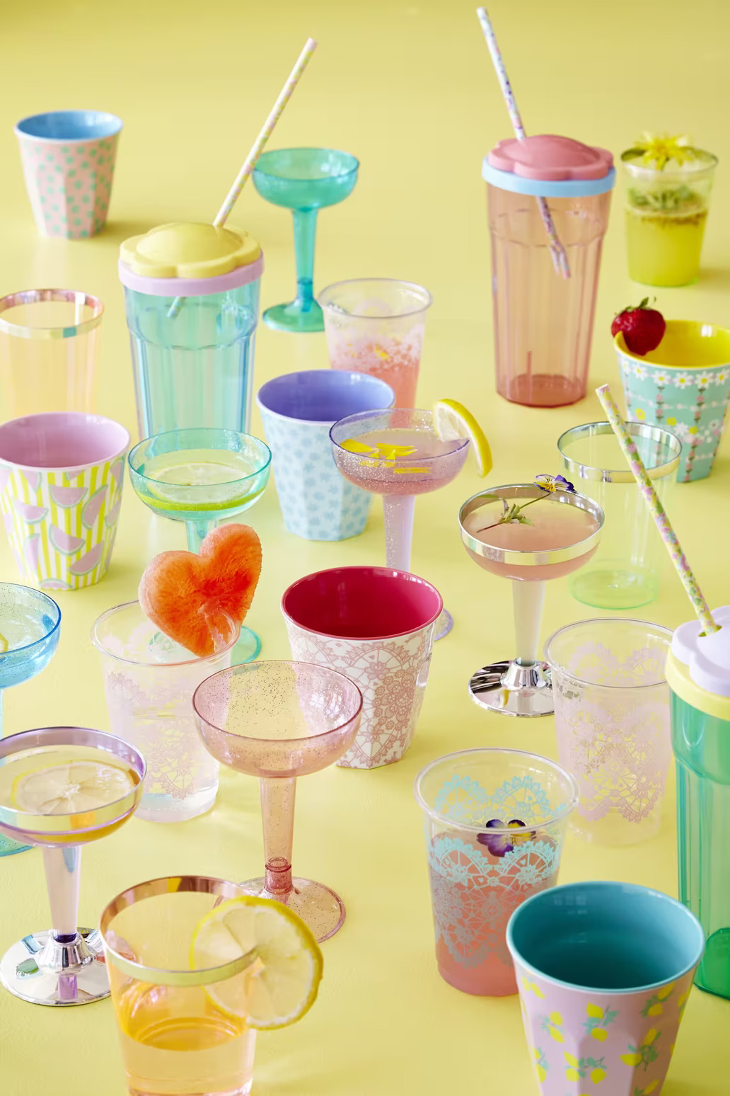 Bilden uppvisar en härlig och färgglad samling av olika dryckeskärl placerade på vad som verkar vara en ljusgul yta. Fokus ligger på ett varierat utbud av glas och koppar som utstrålar en känsla av fest och glädje. I förgrunden syns flera olika typer av glas, bland annat champagneglas av märket Rice från Köpstaden.se. Dessa glas är en del av produktserien "Champagneglas Glitter, 6-pack" och har en subtil glittereffekt som fångar ljuset på ett vackert sätt, vilket ger dem en skimrande kvalitativ dimension.