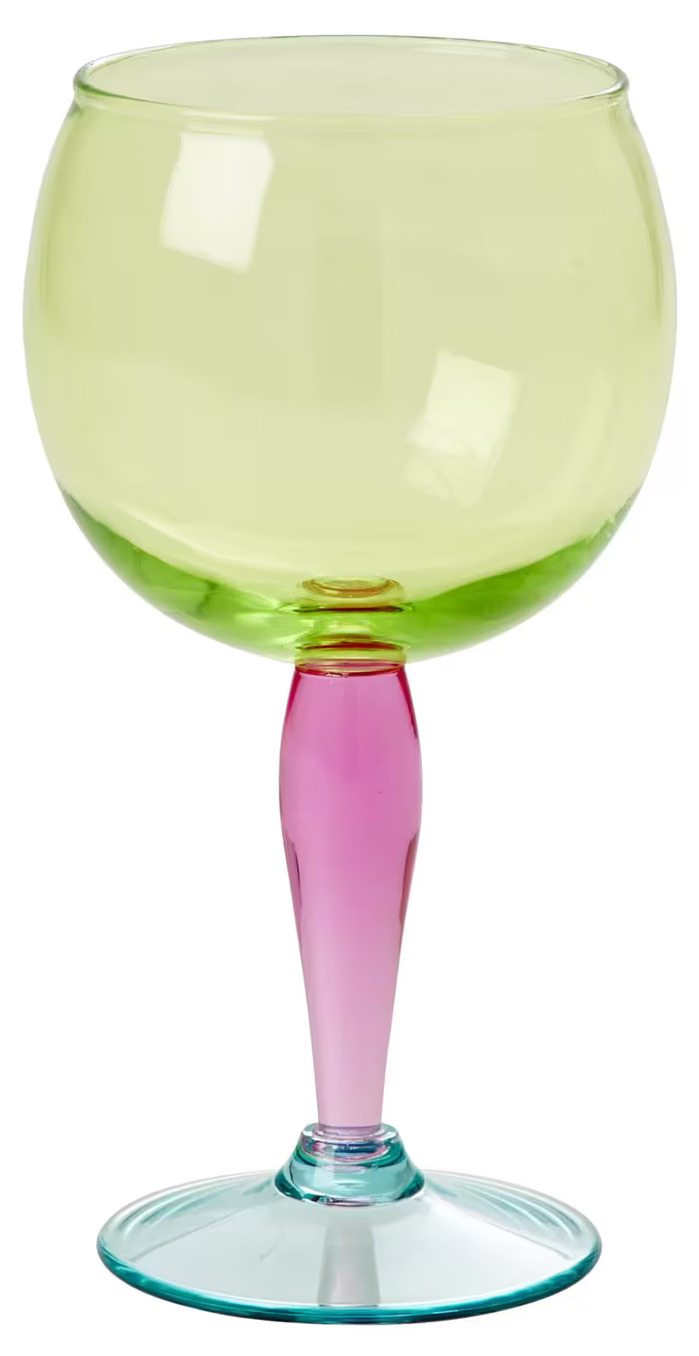 Fot och stam är där glaset verkligen skiljer sig ut. Den långsträckta stamen har en intensiv rosa ton, som kontrasterar mot den gröna kupan. Genom att smalna av något mot fotens bas, övergår stamen till en transparent blå fot, vars rundade form ger vinglaset stabilitet på bordet. Detta färgspel mellan grön, rosa och blå ger glaset ett unikt uttryck, som känns både lekfullt och modernt.